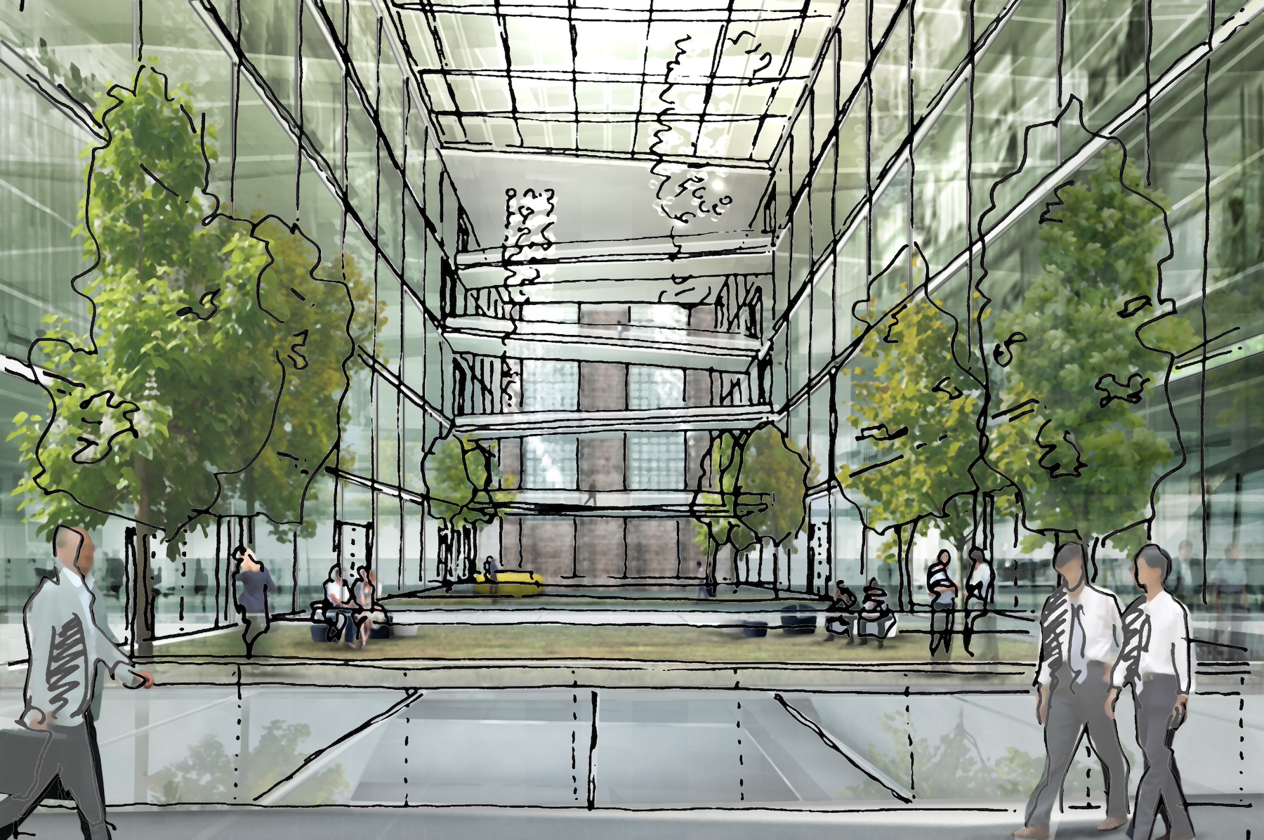 The office concept sketch showed how internal atria could be carved into the deep floorplates to bring natural light into the centre of the building, while exposing the original external brickwork from within. The aim, again, was to maintain visual connection with the historic fabric wherever you are in the building.