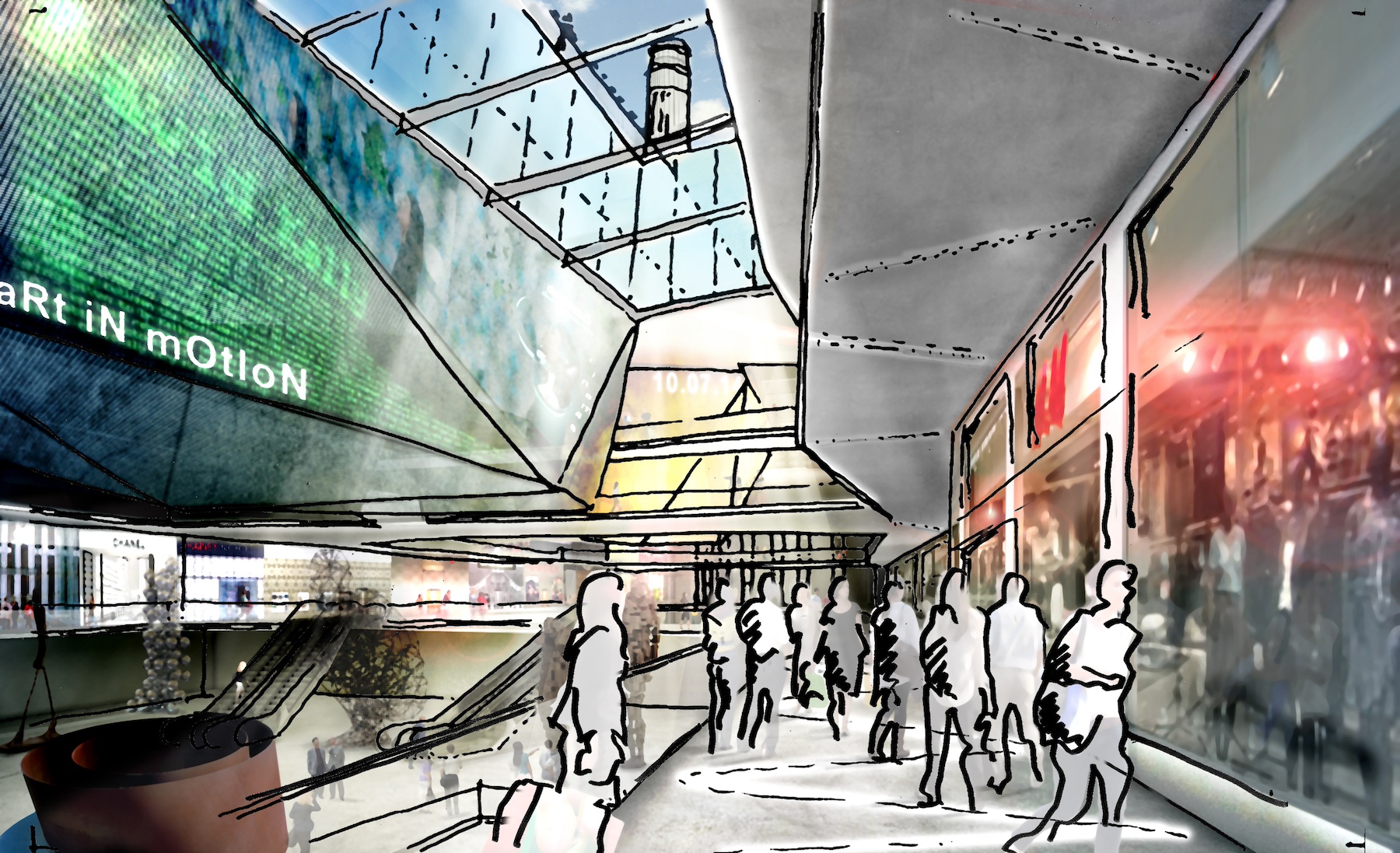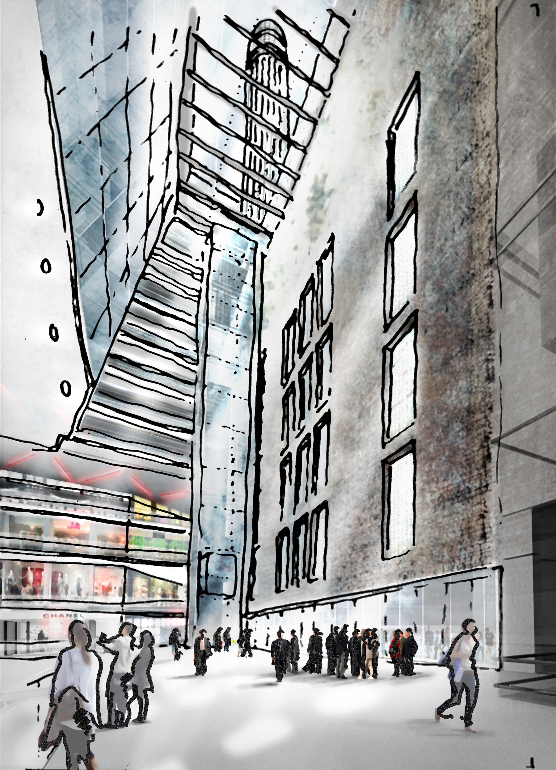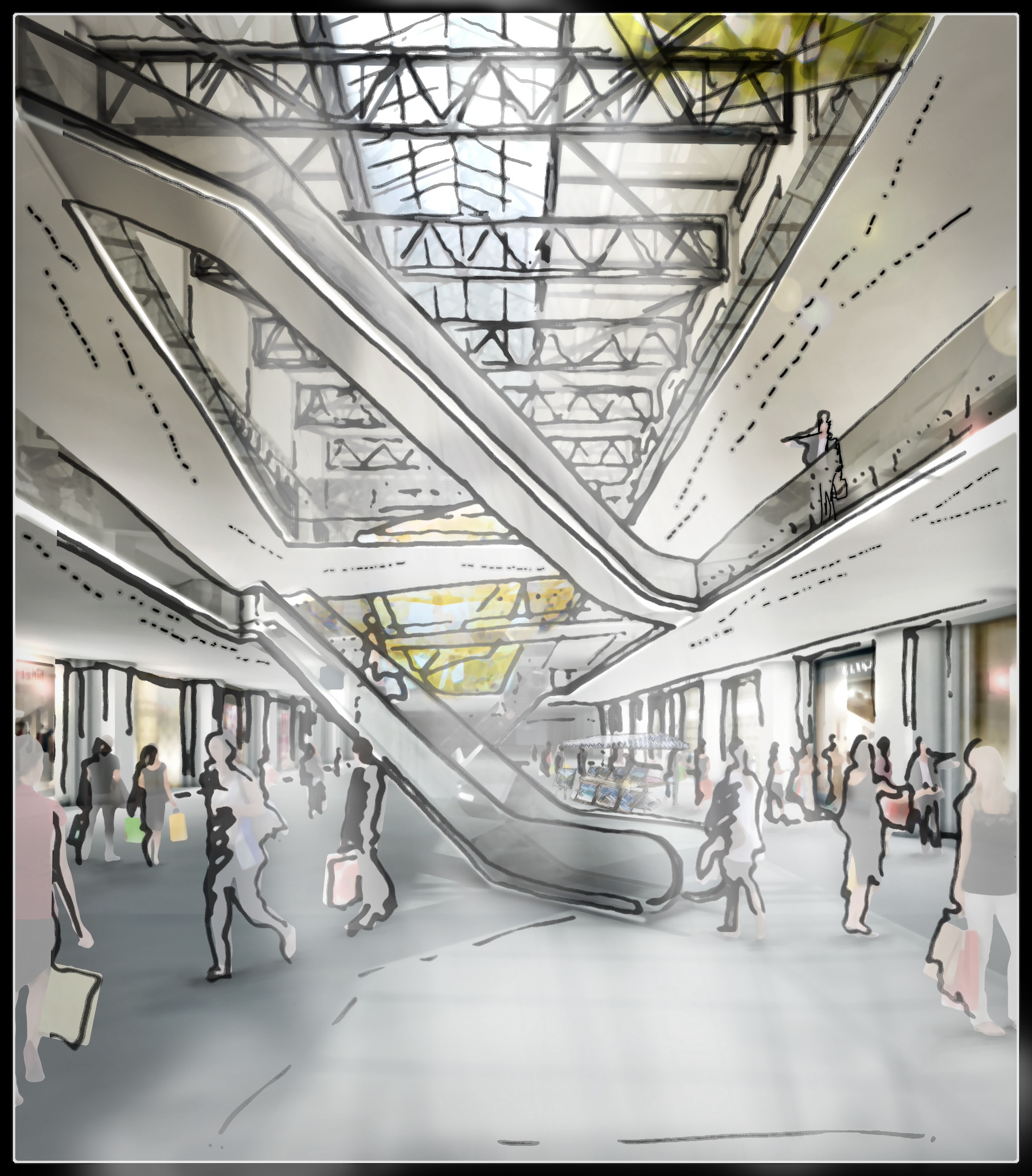The Turbine Halls sketch demonstrated how retail could be accommodated while preserving the remarkable scale and perspective of the space through the careful integration of lightweight bridges and escalators.