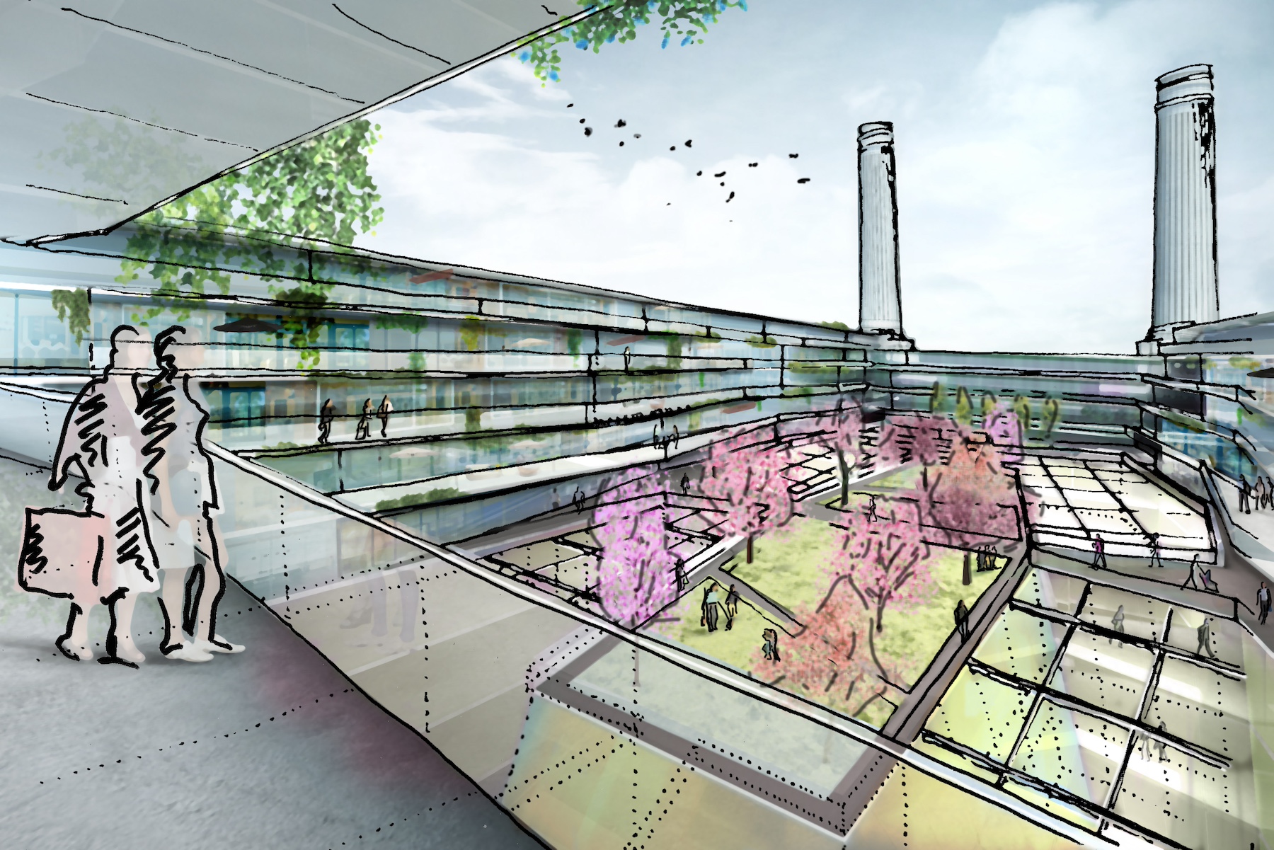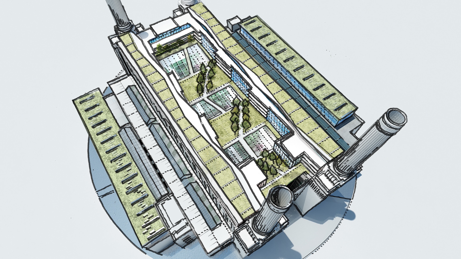 The sketches were deliberately loose, describing a philosophy and attitude to the building, rather than a finished proposal. Their intention was to respect the magic and monumental scale of the heritage architecture while imagining how the building could operate as a functional, sustainable component of the city of London. One where visual clues – glimpses of the chimneys or the brick – would root you in the building.