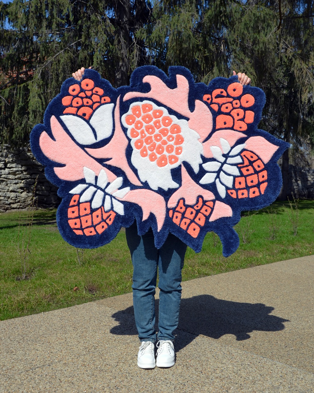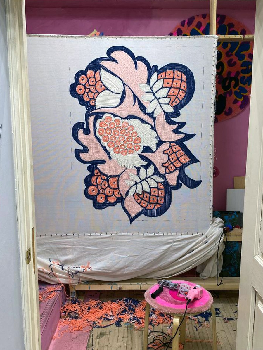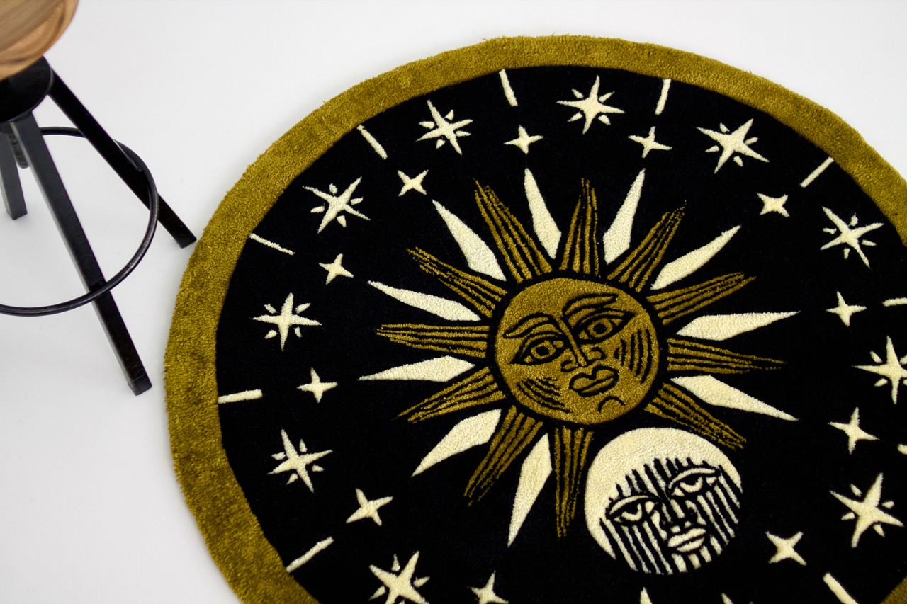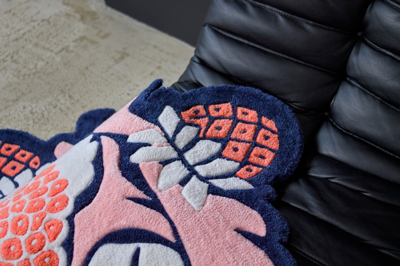The project started with a series of sketches, then the master transferred the most successful solutions of the contours to the product blank for execution using the tufting technique. Hand tufting technology is a method of making carpets in which a twisted thread is driven into the base. The yarn is inserted through a pneumatic device resembling a gun. It shoots compressed air, which fixes the thread, creating a knot on the fabric base. Then the pile is fixed on the back with latex and covered with a backing. After that, the carpet is cut according to the design and carefully cleaned.