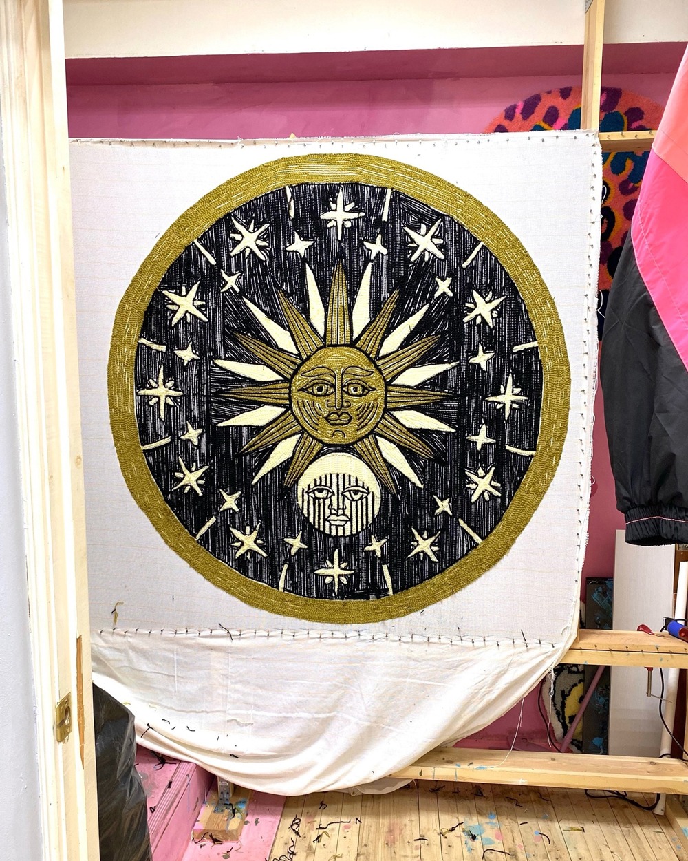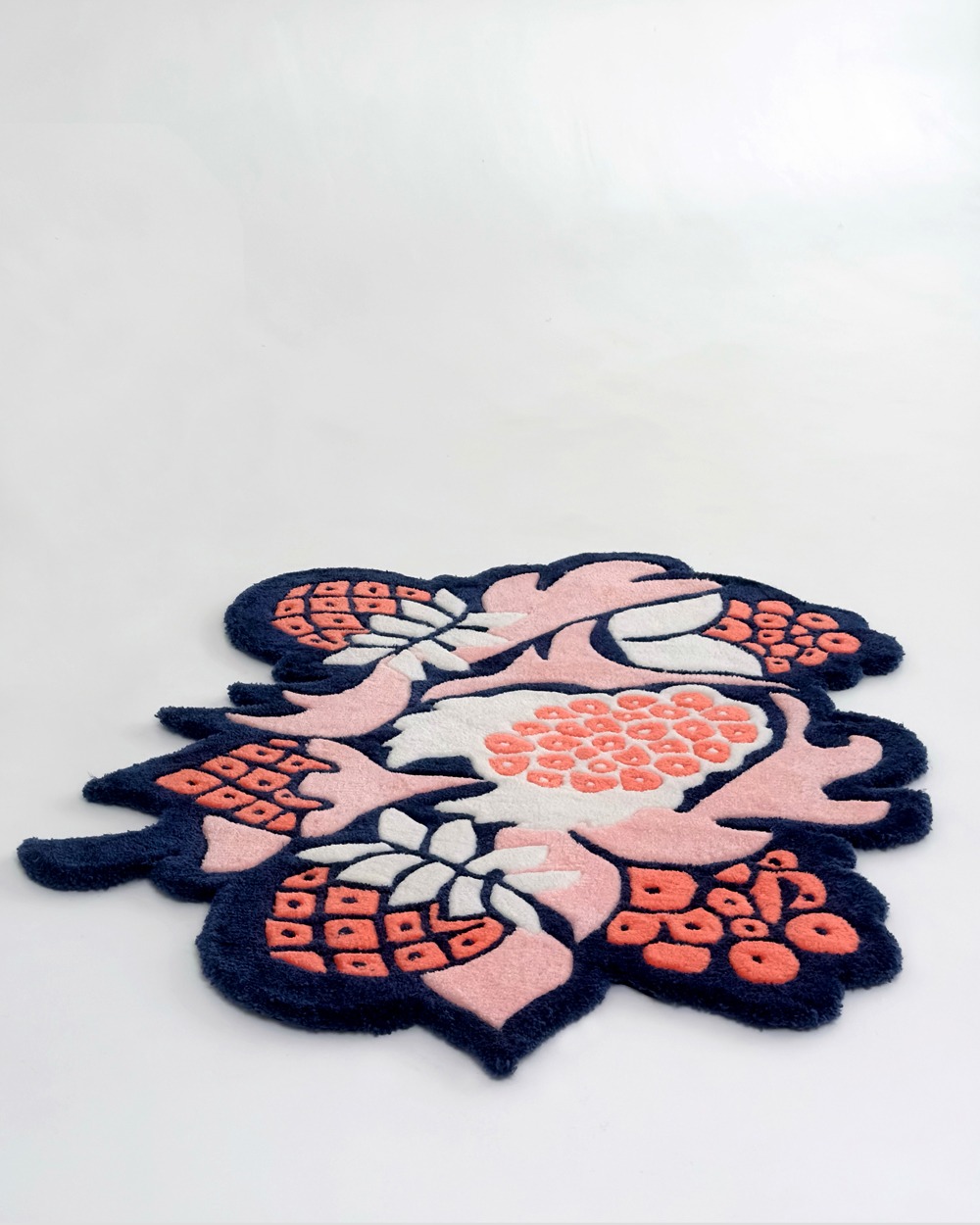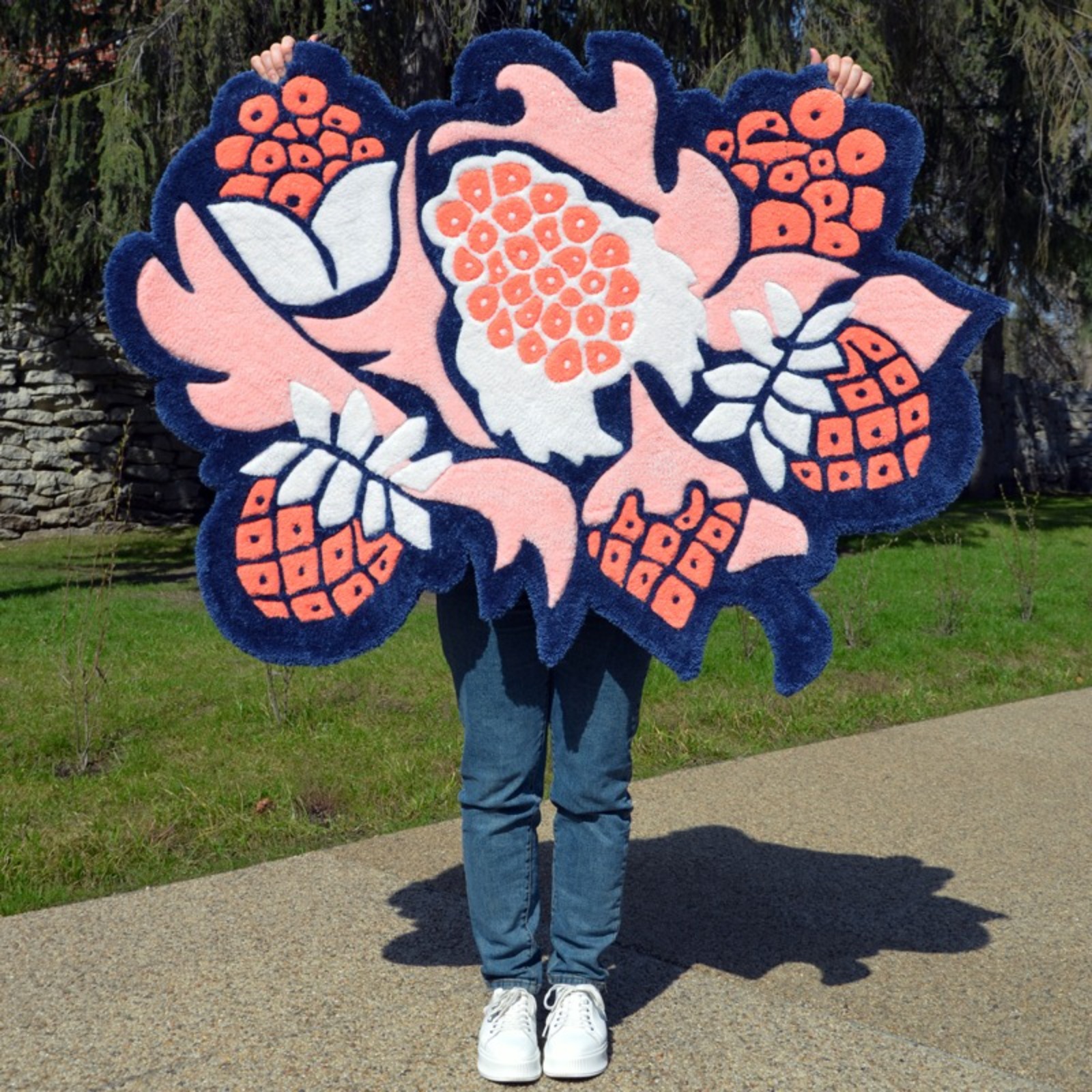 The project started with a series of sketches, then the master transferred the most successful solutions of the contours to the product blank for execution using the tufting technique. Hand tufting technology is a method of making carpets in which a twisted thread is driven into the base. The yarn is inserted through a pneumatic device resembling a gun. It shoots compressed air, which fixes the thread, creating a knot on the fabric base. Then the pile is fixed on the back with latex and covered with a backing. After that, the carpet is cut according to the design and carefully cleaned.