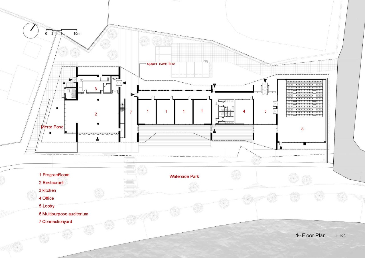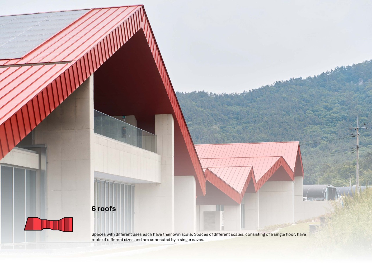 The architecture is defined by six fragmented roof volumes, each corresponding to different program scales. These are unified by a continuous deep eave that extends into outdoor spaces, creating a series of in-between environments that blur the boundary between interior and exterior.