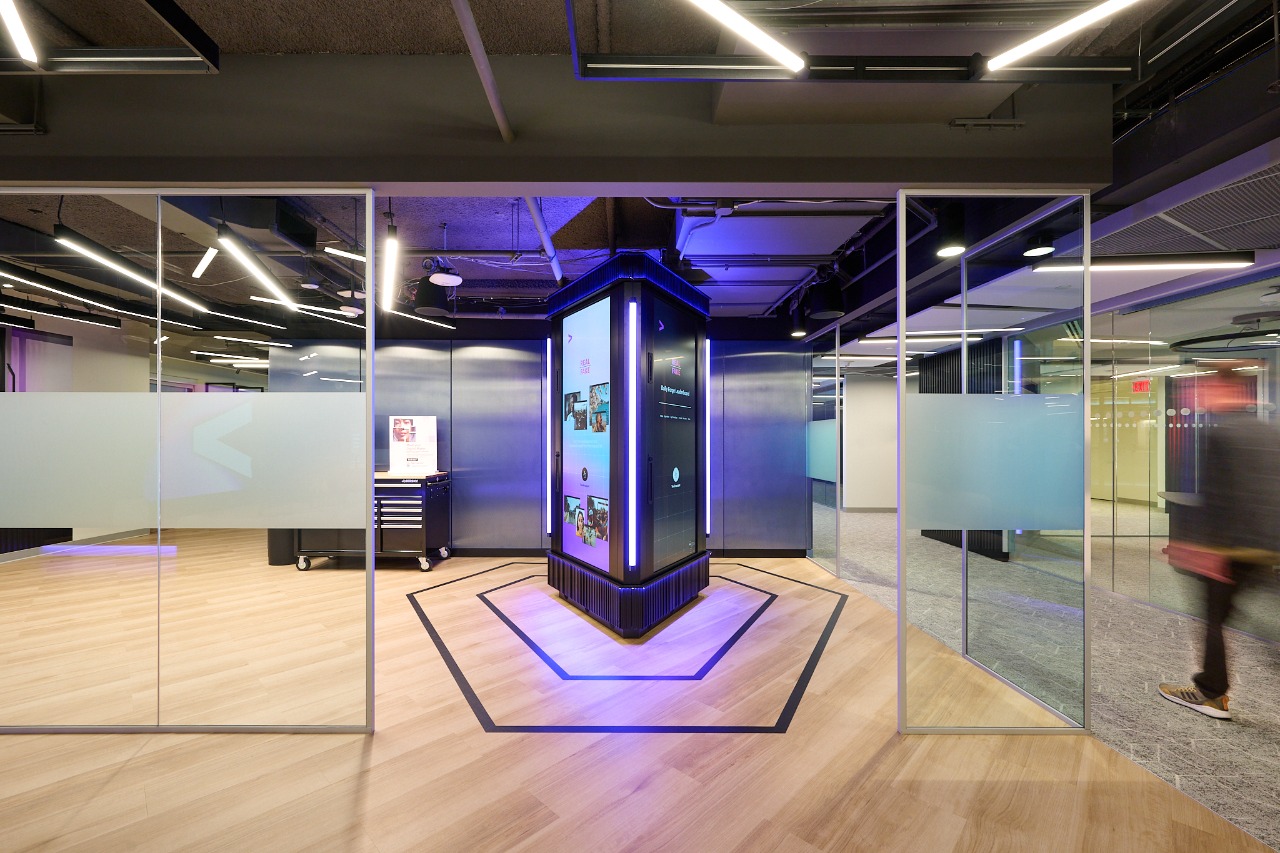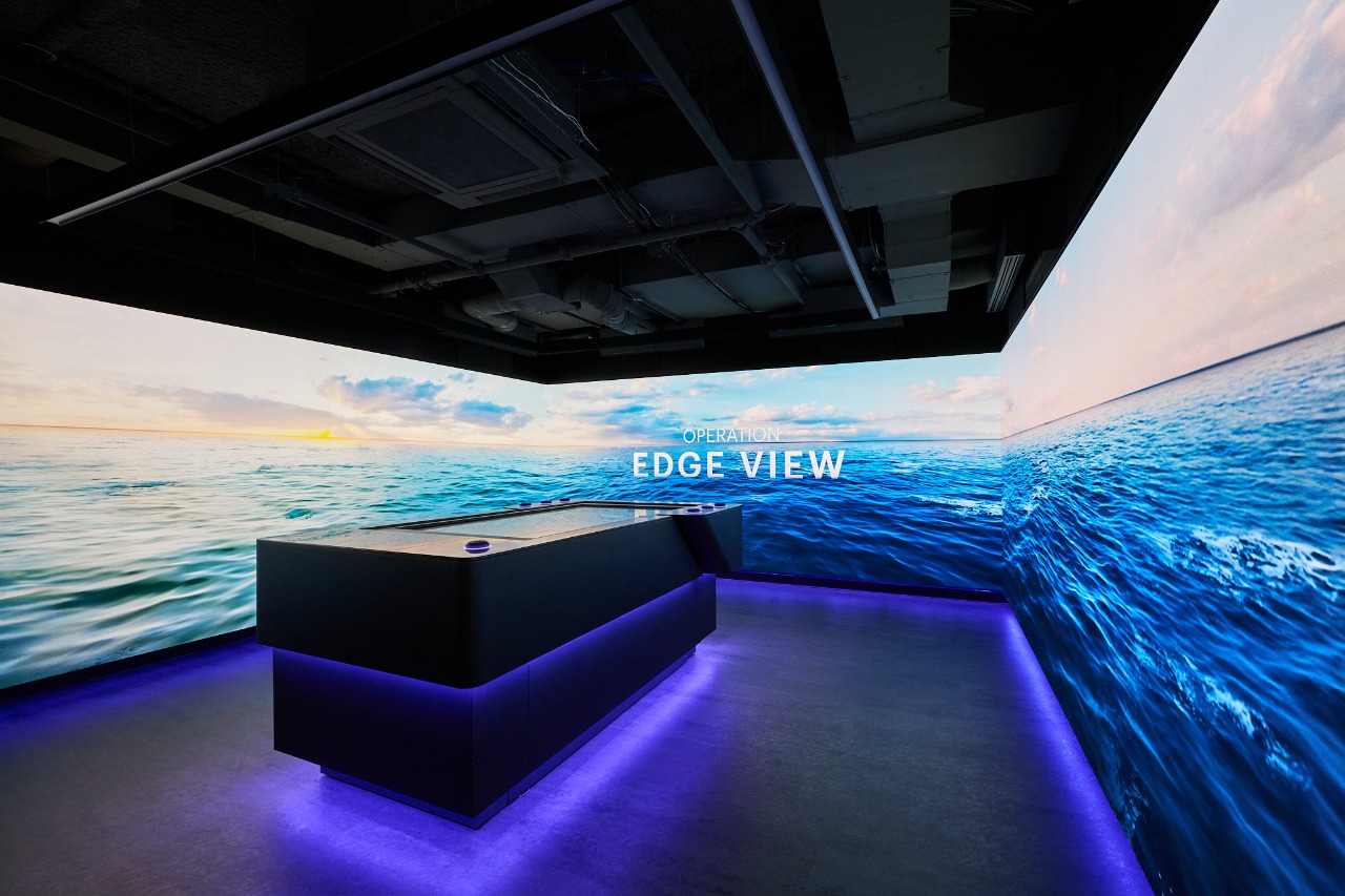 The design sets a clear progression from entry to full immersion. The experience begins at The Reception, where customizable lighting and tailored welcome messaging set the tone for a high-tech, high-touch day of guided experiences. From there, The Hub operates as a room-scale presentation volume: an ultra-wide, floor-to-ceiling digital wall that shifts the center from static briefing to spatial storytelling and collaborative work.