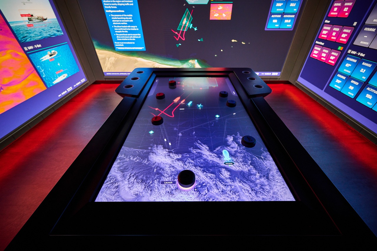In the The Sandbox and Expo, visitors choose demonstrations and interact with the latest technology in a flexible, workshop-ready setting. The Control Room intensifies the experience with 270 degrees of wraparound video display and an interactive object-recognition touch table, anchoring a data-led, scenario-based “critical mission” environment where participants step into the role of decision maker. The environment includes spaces for hosted sessions and video broadcasts plus rotating interactive elements and regular updates so the center can evolve over time instead of staying tied to a single narrative.