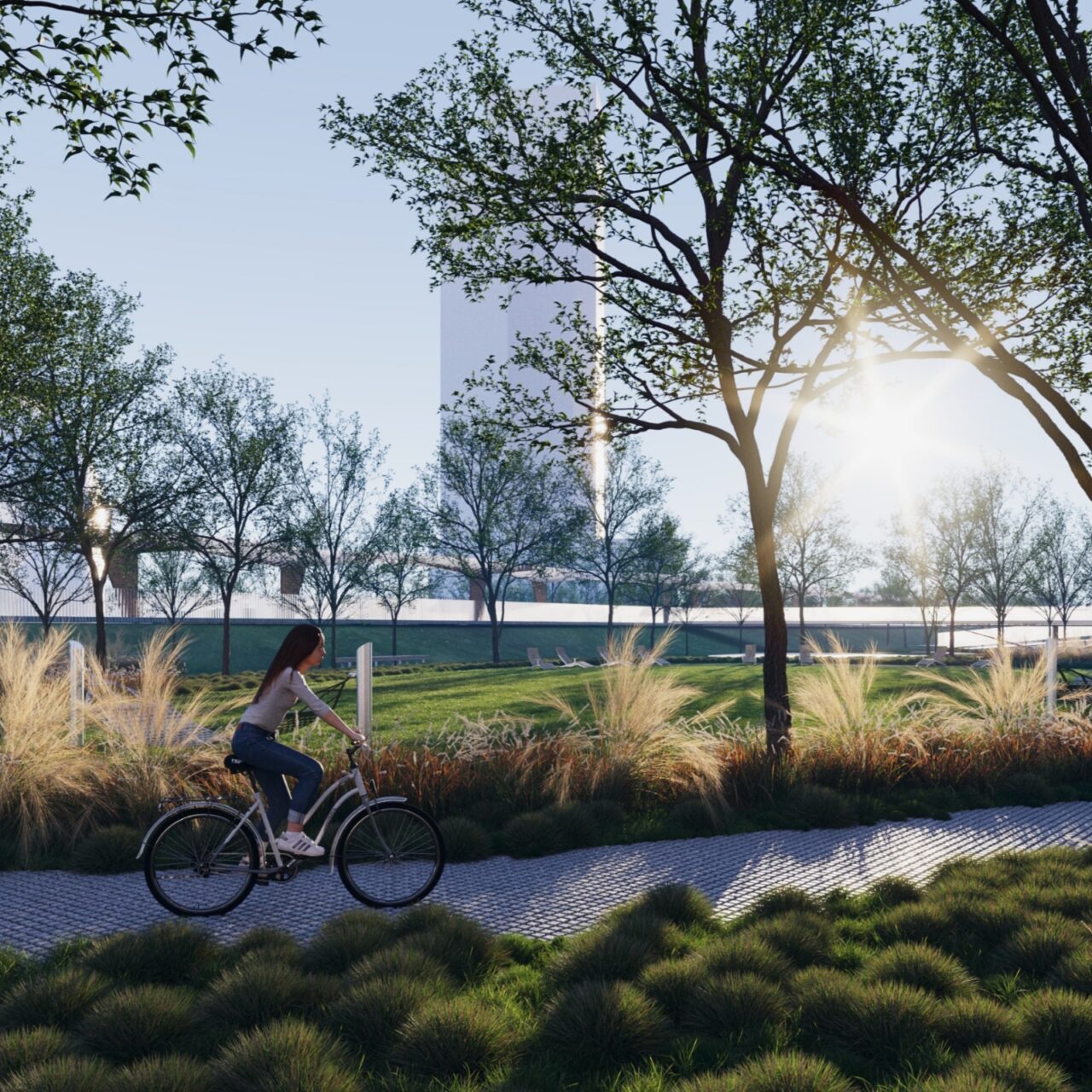 At the heart of the design lies the main pedestrian axis, linking the residential quarter with the river via a pedestrian bridge that runs through the entire park, emphasizing its continuous, connective nature. Along this axis is the central square, the civic heart of the park, where flows of people, events, and life converge.