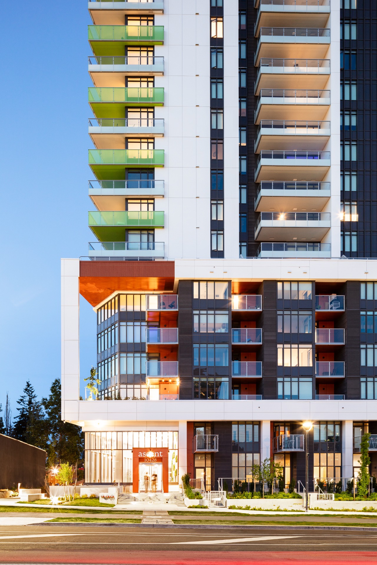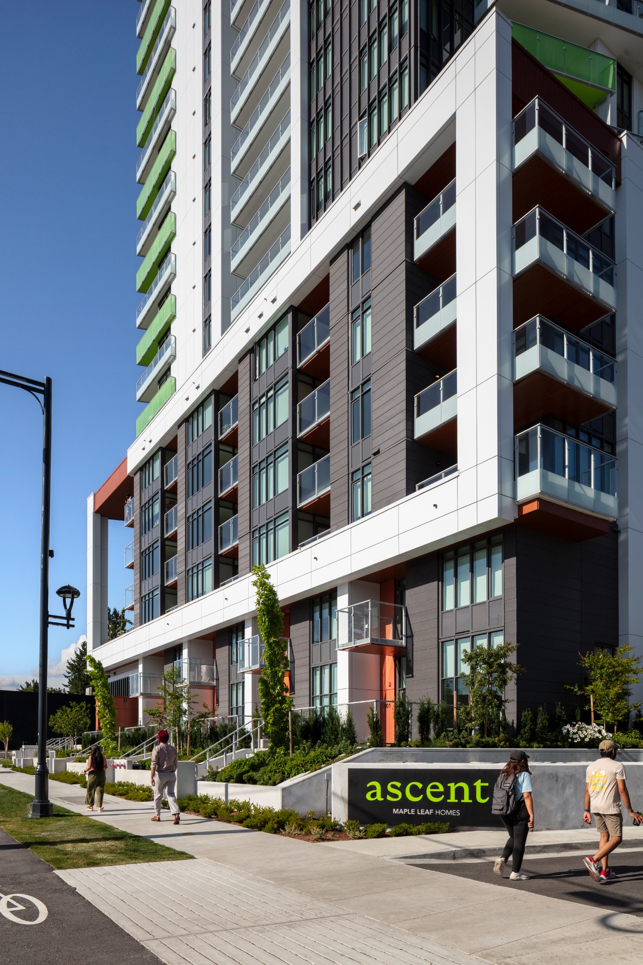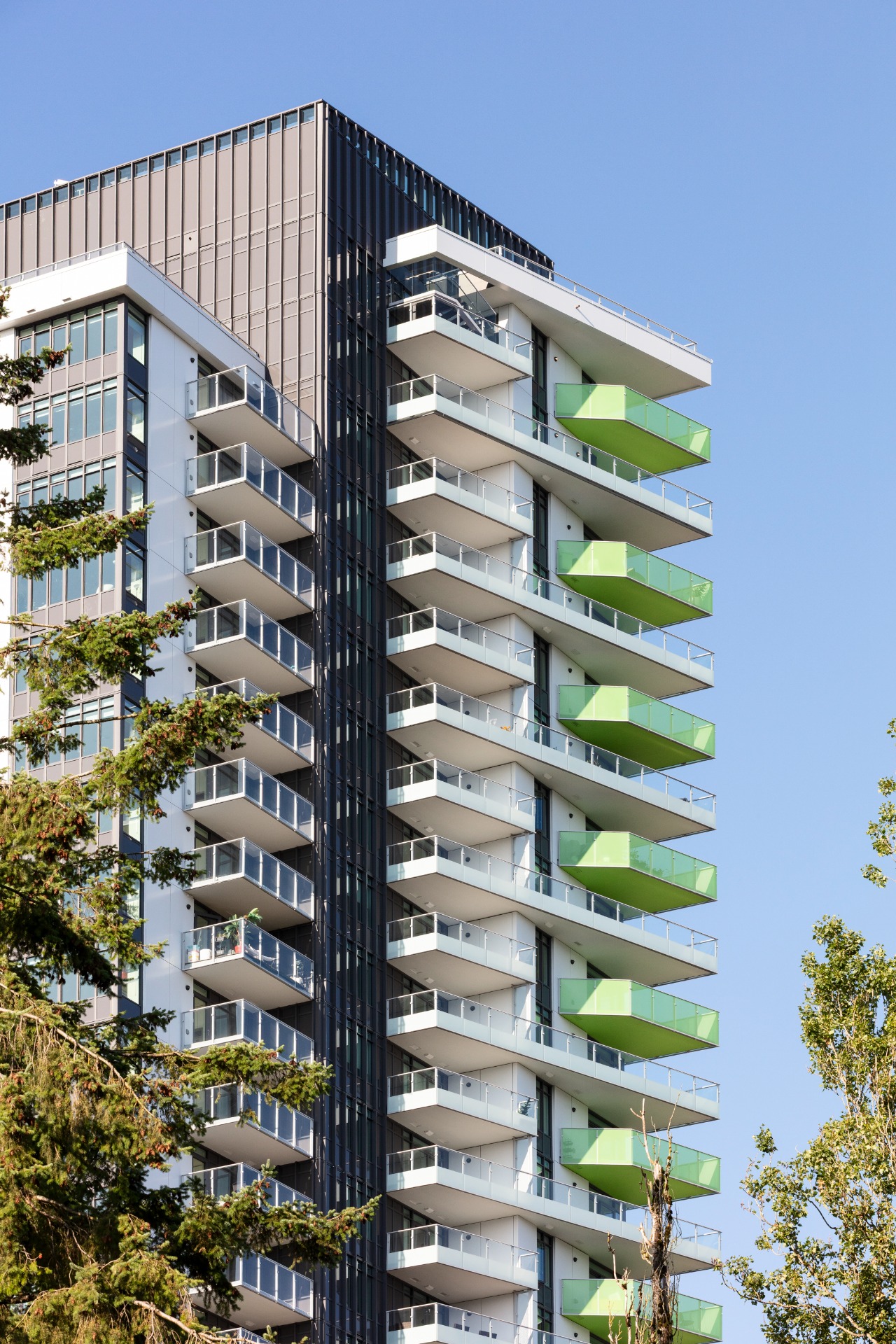 The overall light colour palette of the tower, with its white metal panels, is contrasted by a simple repetitive pattern of vertical projecting charcoal window mullions and grey spandrel glass that extends up the height of the tower, becoming a feature enclosure at the top of the building. A fresh green colour ceramic frit, that takes its inspiration from the surrounding distant landscape, is used on the glass of feature balconies. As the first project to be completed in this emerging neighbourhood, Ascent paves the way for the transformation of this area in transition. Balancing livability and efficiency the project creates a striking architectural addition to the skyline of the downtown Surrey.