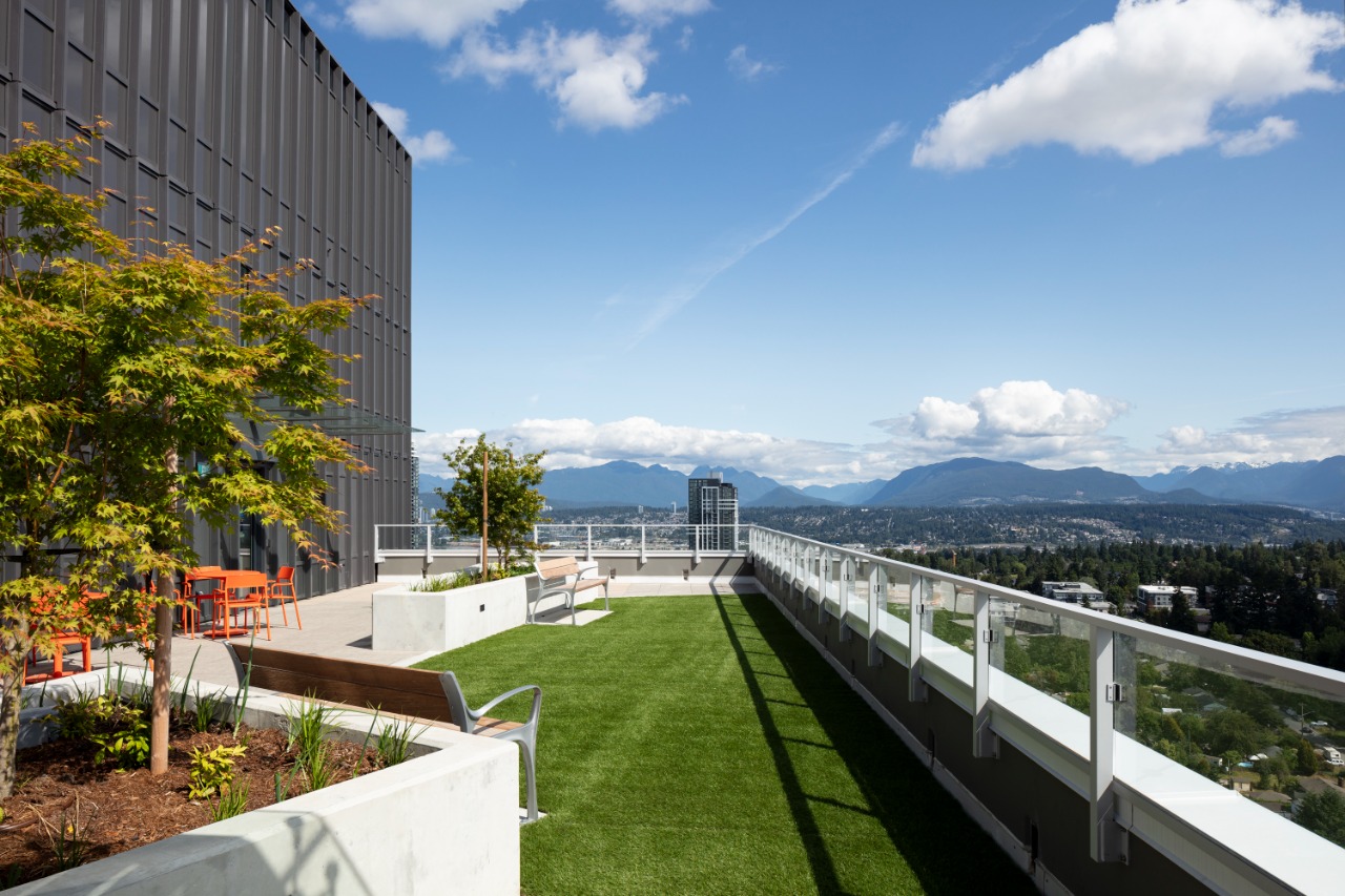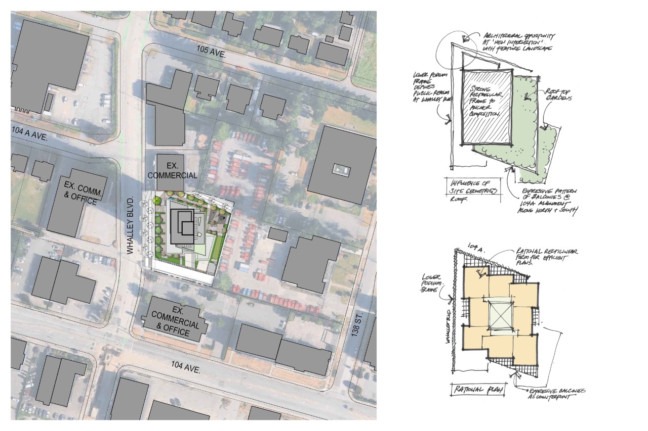 A simple rectangular tower form that is oriented to be parallel to Whalley Blvd. anchors the building composition. Feature balconies are skewed and oriented to the north and south property lines providing both contrast and architectural interest. The top two levels of the tower are set back from the east to provide a large roof terrace that opens to distant mountain views for all residents to enjoy. Asymmetry in the composition provides for areas of exuberance and areas of relative visual quiet, while an alternating pattern of balconies is used to create a strong rhythm to both the north and south facades.