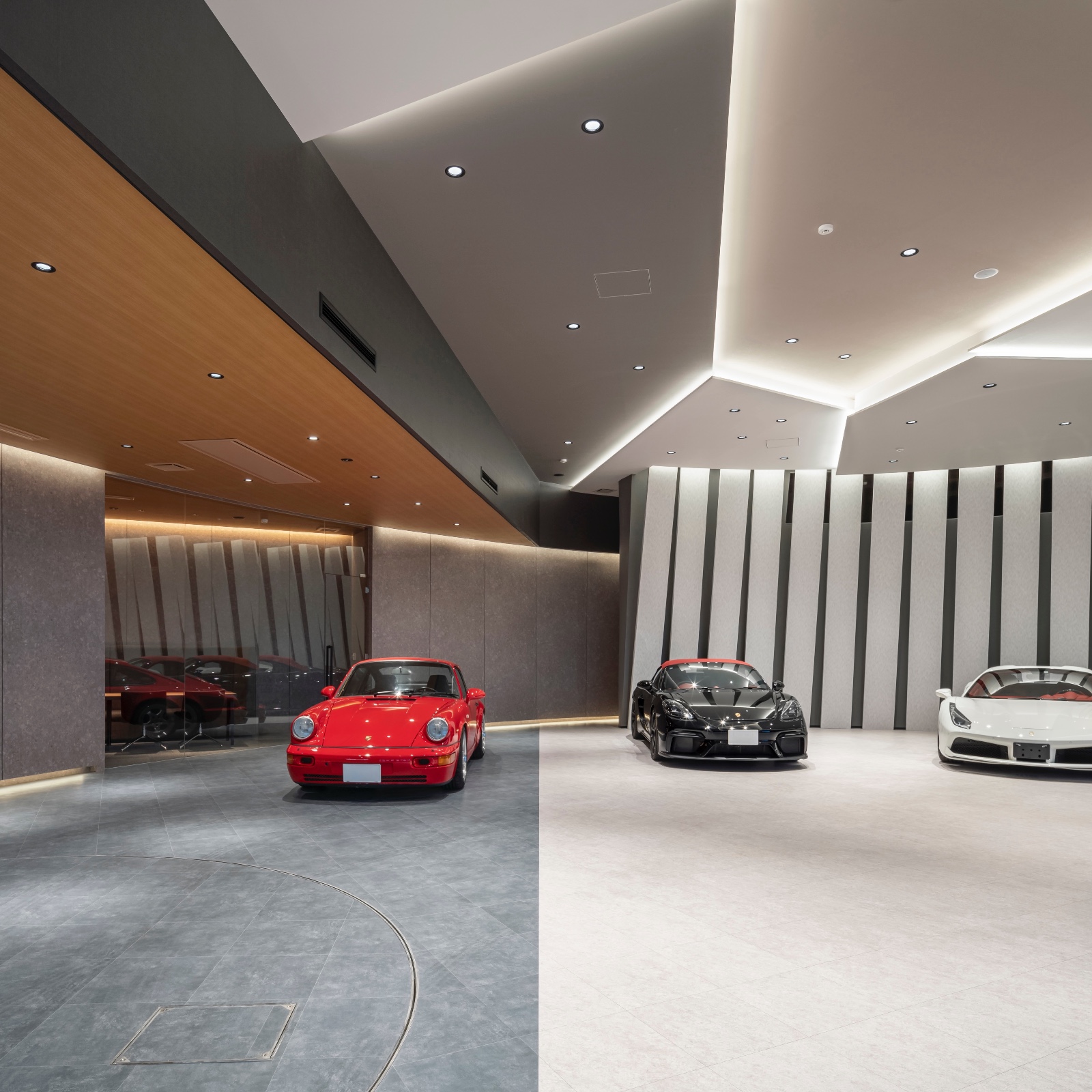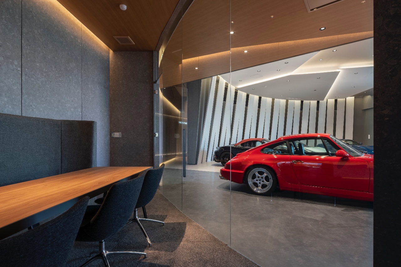 The exhibition space and negotiation room are separated by glass, but are seamlessly connected. The vehicles on display can be seen from the negotiation room, so visitors can always be aware of them. However, the lighting in the negotiation room is kept low to ensure privacy. In addition to this negotiation room, we also have another one, which we use depending on the situation.