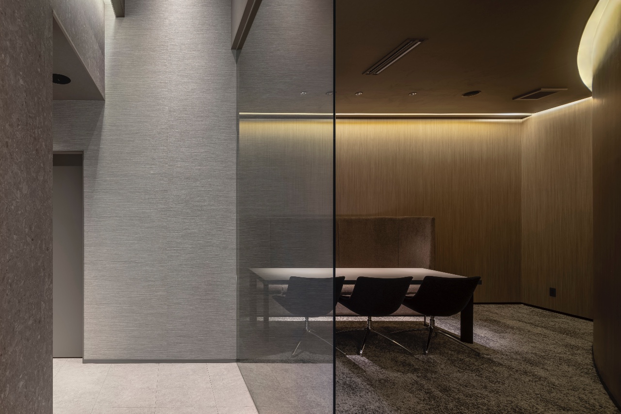 The unique design of the ceiling is particularly noteworthy. It is divided into two levels, one high and one low. The higher section is made of multiple thinly sliced panels, creating a floating feeling. Indirect lighting filters in through the joints between the panels, creating a fantastical ceiling. This is truly the highlight of the space. Indirect lighting is also installed in various other areas, effectively enhancing the space.