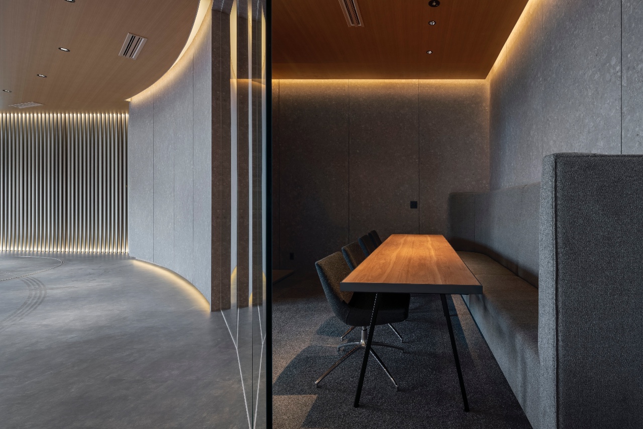 Conference rooms, offices, restrooms, and other facilities are located around the circular exhibition space. The high ceiling and spacious space are meticulously designed with a streamlined layout.
