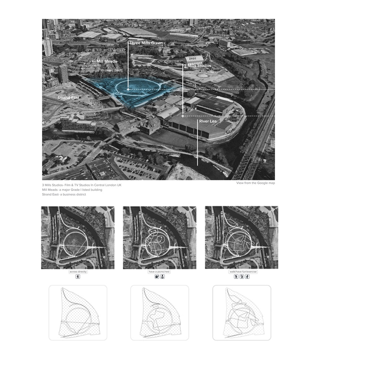 The site, Three Mills Green, is an open green space owned by the Lee Valley Regional Park Authority and located adjacent to 3 Mills Studios, a major film and television production studio. Different user movements are mapped according to the site’s characteristics: visitors passing through tend to follow the main routes, while those resting or picnicking gravitate toward more open gathering areas.