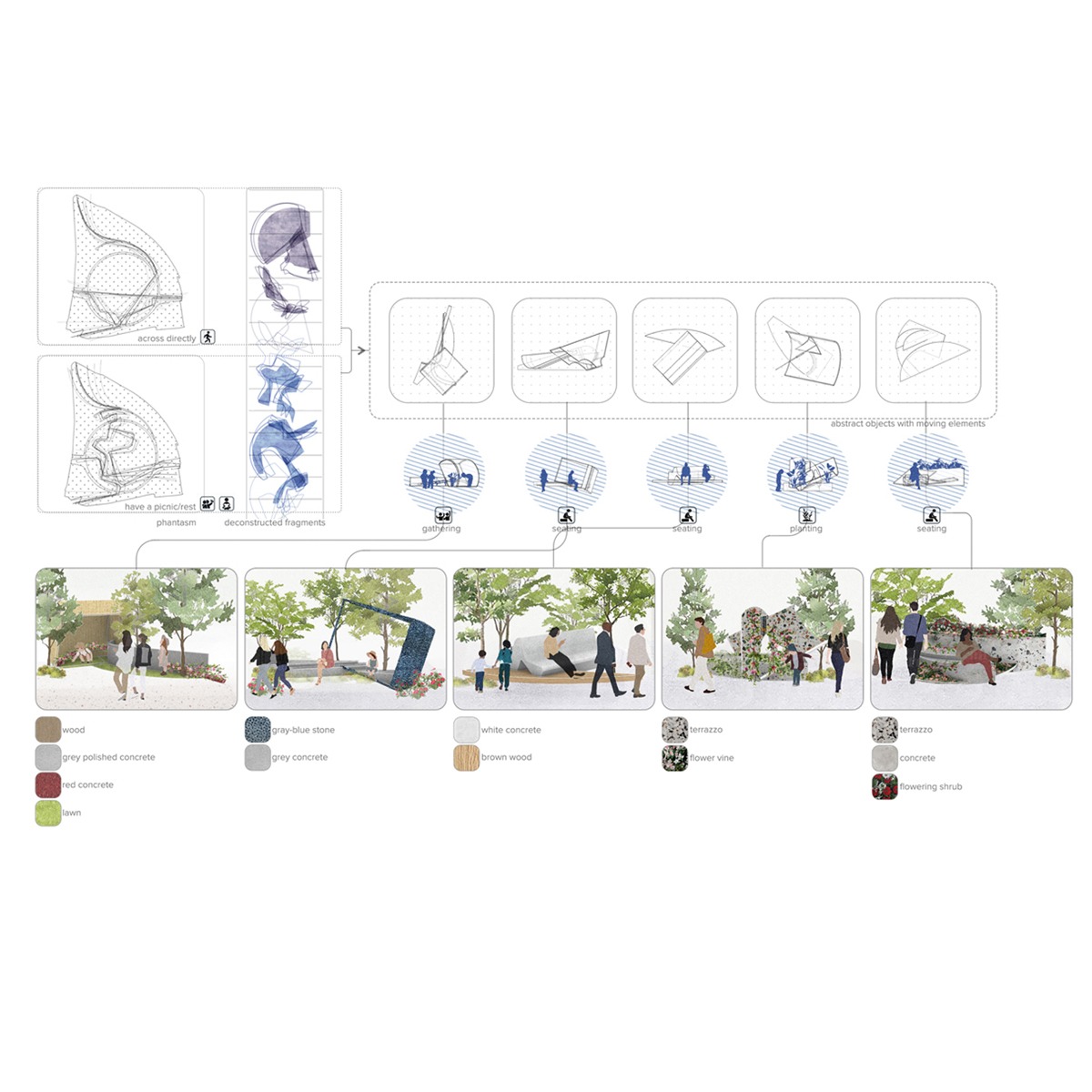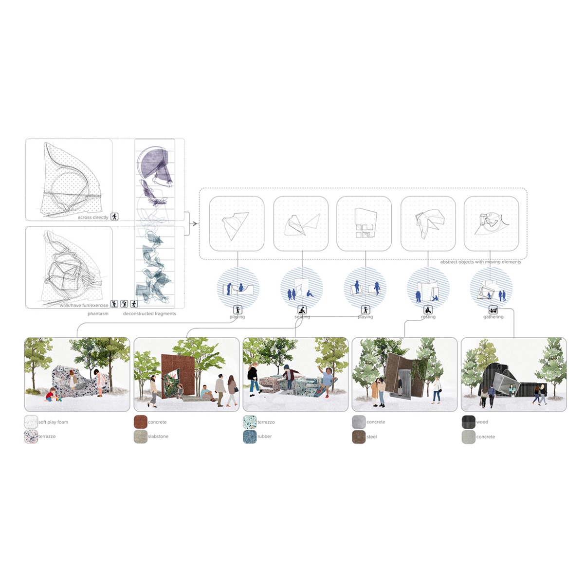 Mapping these movement patterns and translating them into landforms reveals the underlying logic of urban “scripting”, where landscape inhabitants continuously form their own paths and interpretations. The resulting landscape celebrates a choreography of movements—fleeting and slow, meandering and direct—embedding new narrative layers into the site.