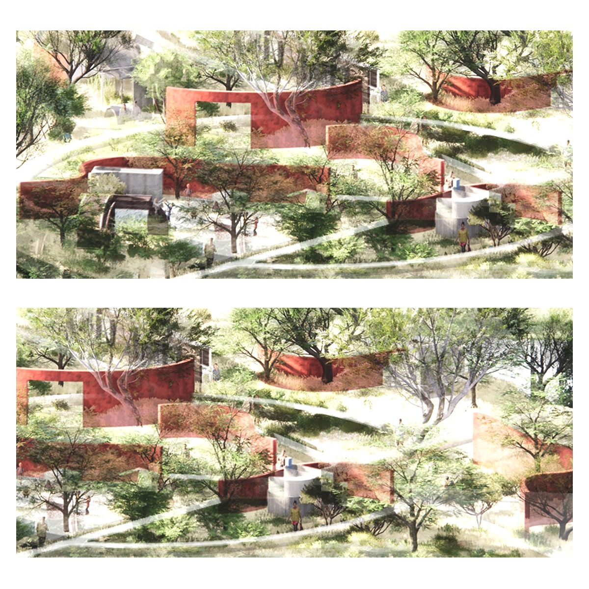 Drawing from Tschumi’s idea that architecture emerges from the superimposition of space, movement and events, the project extracts elements from real site activities and cinematic narratives associated with the nearby studios. Through processes of deconstruction, transformation and superposition, movement, events and space collectively redefine the spatial structure and experiential narrative of the landscape.