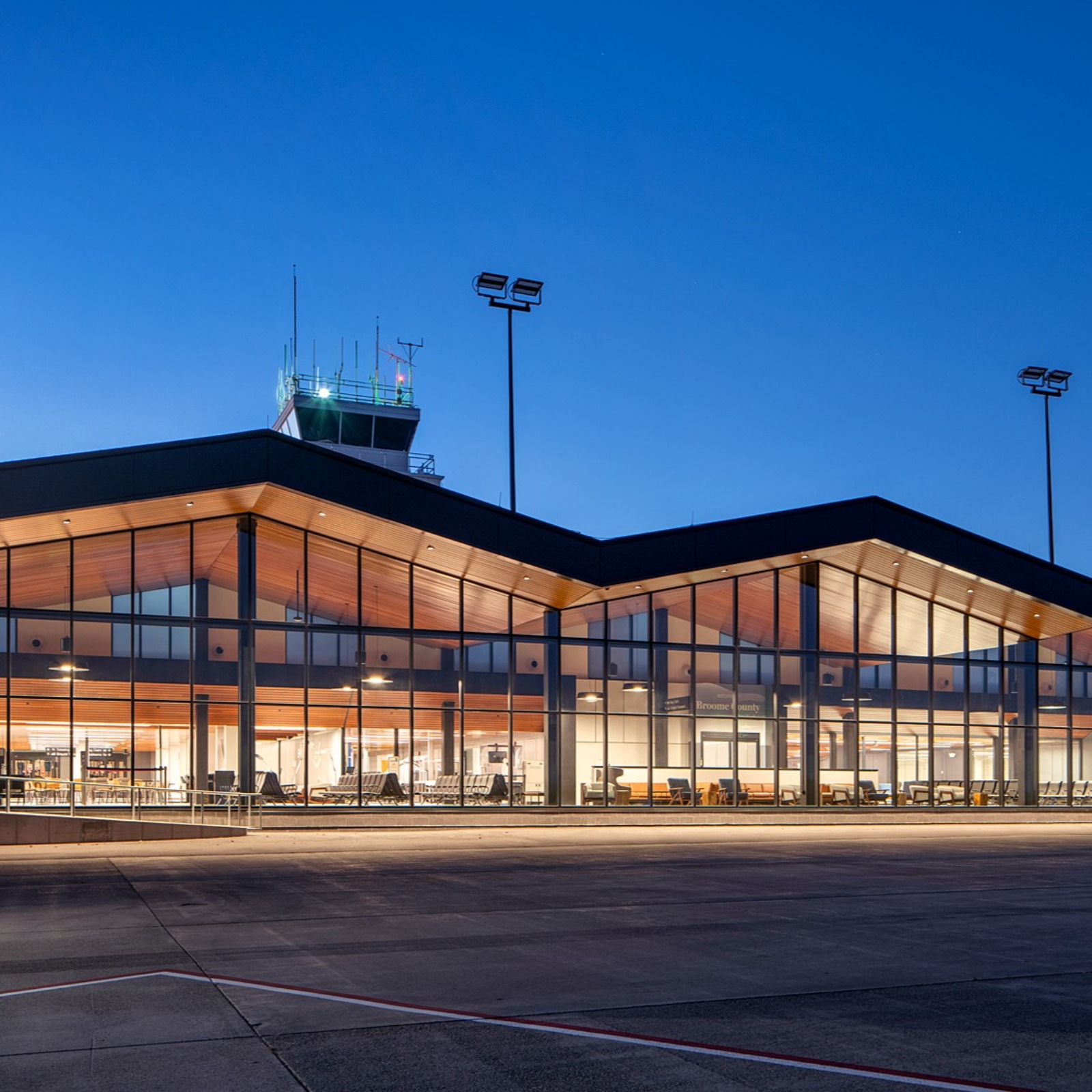 The project fully upgrades the airport by renovating the departures lounge, holding lounge, and baggage claim area, reconfiguring the ticketing lobby and outbound baggage area to improve circulation and efficiency. Terminal facilities and amenities, including restrooms, office space, and a multi-purpose room, are also upgraded and refurnished. New additions include a TSA Checkpoint/Exit Lane, new passenger boarding bridges to support larger aircraft, HVAC upgrades, airport approach improvements, and new canopies and entries.