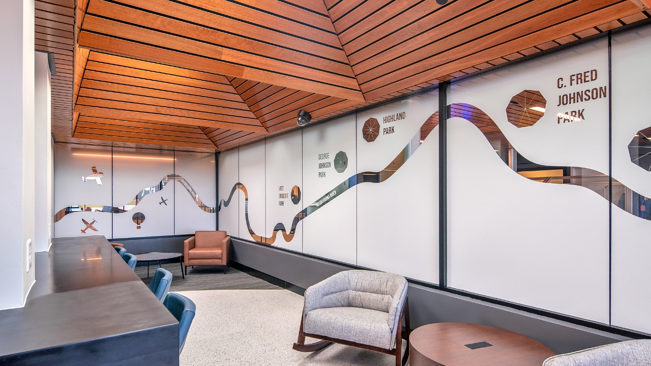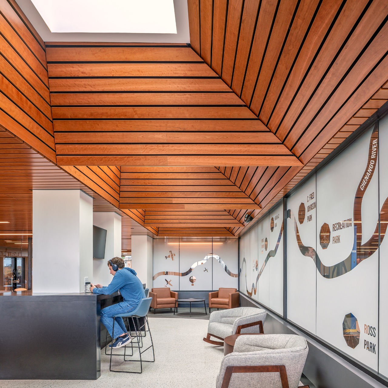 Comfortable, rustic furniture reinforces the lounge-like experience, and a locally inspired graphic mural playfully showcases Binghamton’s iconic carousels, creating a strong sense of place.