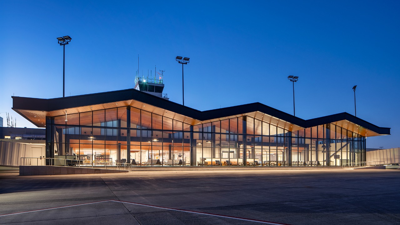 The terminal’s lodge-like design features a striking canopy that mirrors the peaks and valleys of surrounding mountains, while warm wood accents enrich interior and exterior—echoing the surrounding forests viewable from the departures lounge and airfield from baggage claim through light corridors that connect the land and air sides of the terminal.