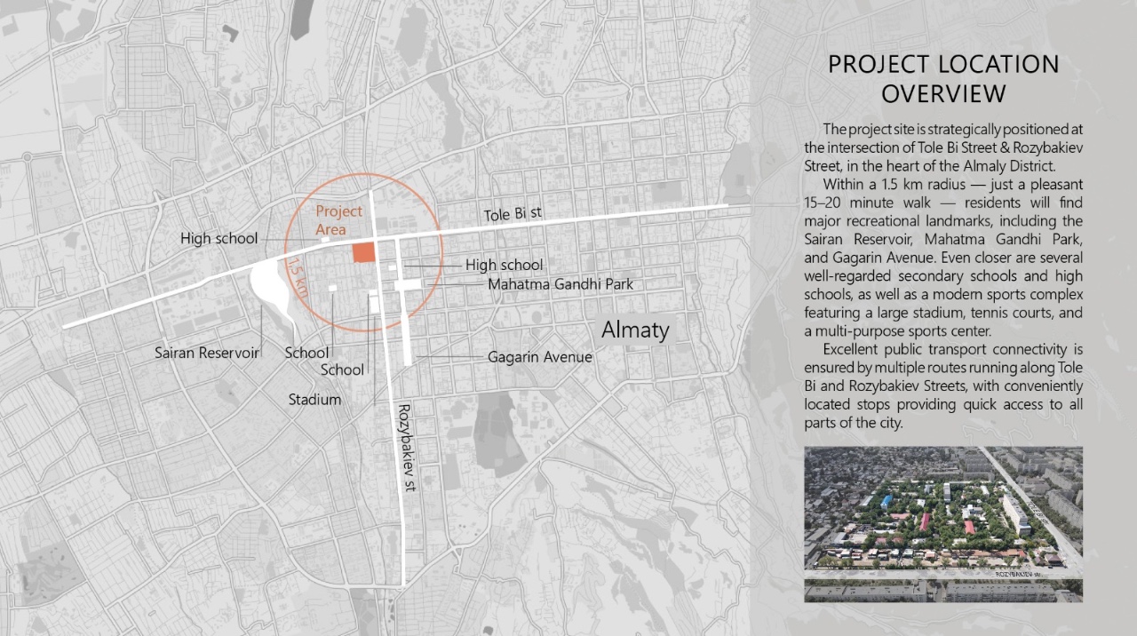 In the heart of Almaty, at the intersection of Tole Bi and A. Rozybakiev Streets, a new residential district is emerging that combines urban comfort, safety, and a strong connection to nature. Located in the Almaly District, the project is surrounded by major city landmarks such as Sairan Reservoir, Mahatma Gandhi Park, Gagarin Avenue, schools, gymnasiums, and a sports complex — all within a comfortable 15–20 minute walking distance. Convenient public transport routes along Tole Bi and Rozybakiev Streets ensure fast connections to all parts of the city.