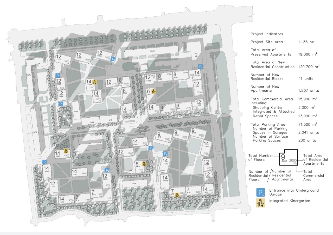 The architectural concept is based on four residential blocks with perimeter-style development that integrate carefully into the existing urban fabric. Existing buildings are preserved and incorporated into the new structure, while an internal axis along Bogenbai Batyr Street organizes the district and connects its key elements. Semi-enclosed courtyards create a protected and private environment for residents, while the building height composition ensures visual orientation and optimal sunlight access. Underground parking beneath each courtyard provides one or two levels with approximately one parking space per apartment.