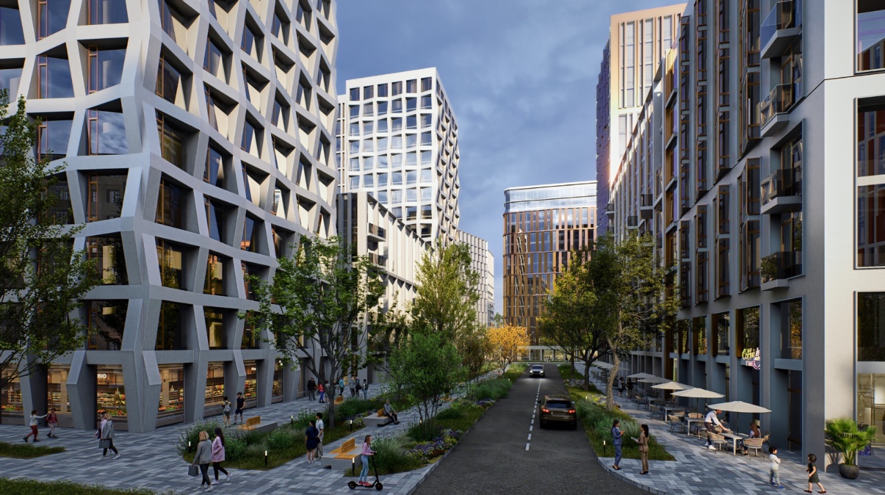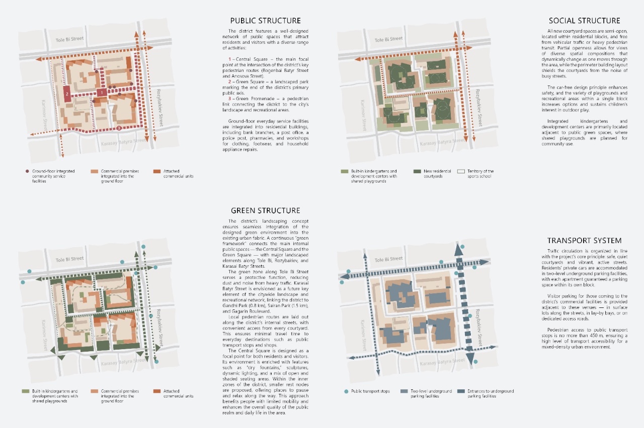 A strong green framework links internal public spaces with surrounding parks and streets. The Central Square and Green Square form the main social hubs of the district, complemented by a landscaped pedestrian promenade and a green buffer zone along Tole Bi Street. Karasai Batyr Street acts as an important connector linking the project with Gandhi Park, Sairan Reservoir, and Gagarin Boulevard.