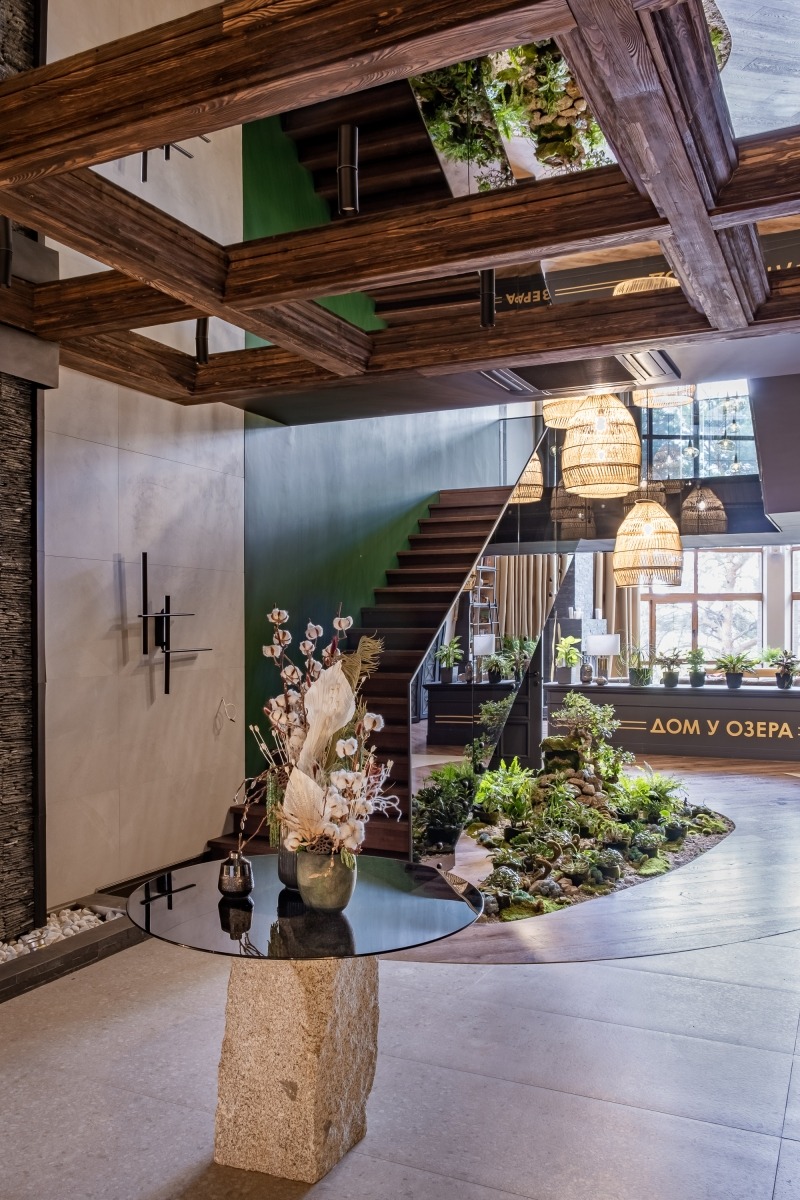 The boutique hotel, with a total area of 1,500 m², was reconstructed on the site of a former building and conceived as an architectural project that creates a harmonious connection with nature. Situated on the shores of the picturesque Lake Shchuchye, it draws inspiration from the surrounding landscape and predominantly uses local materials.