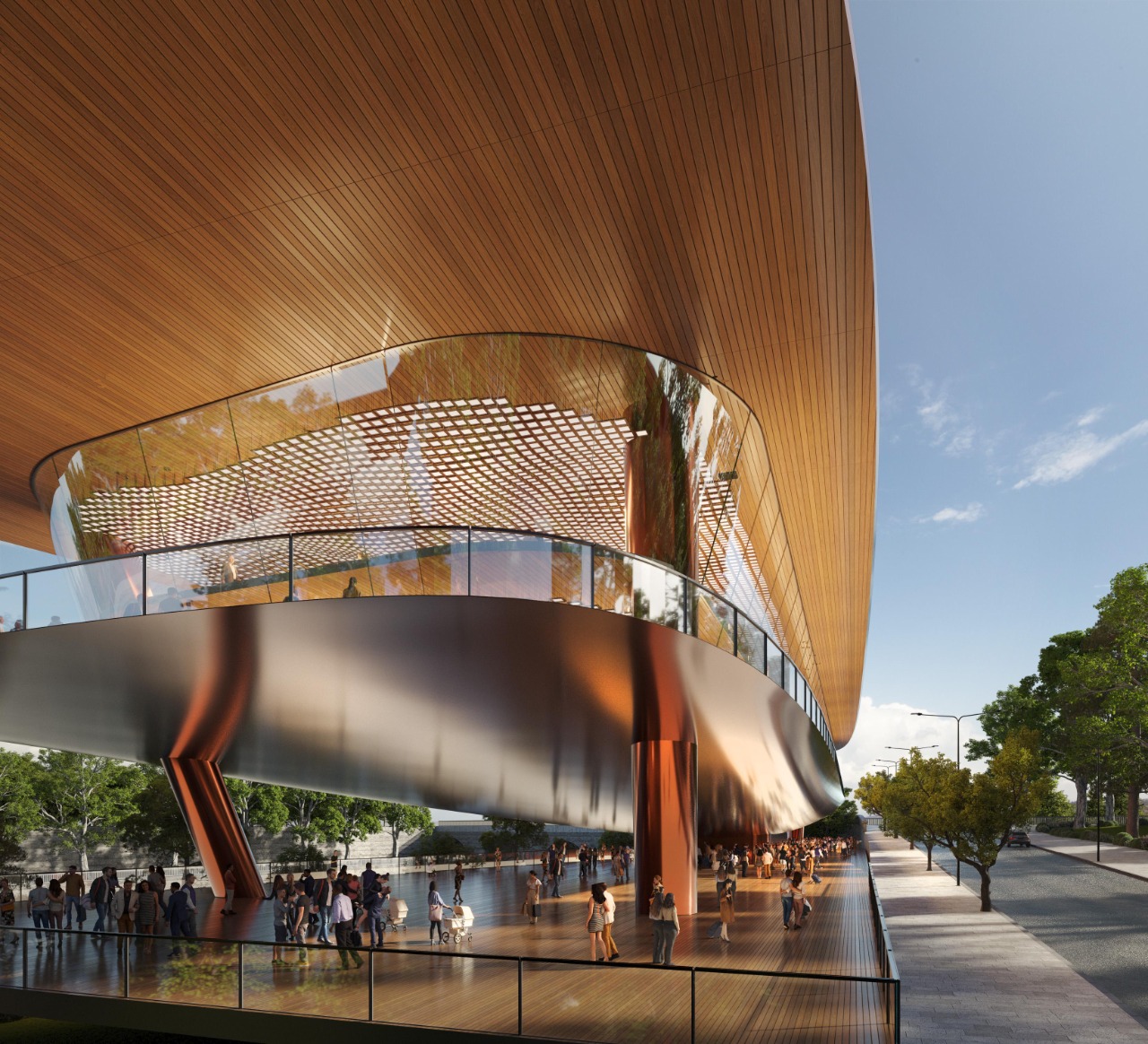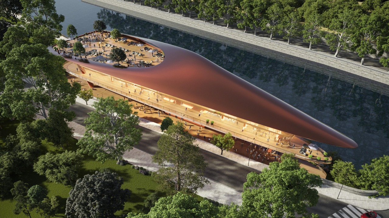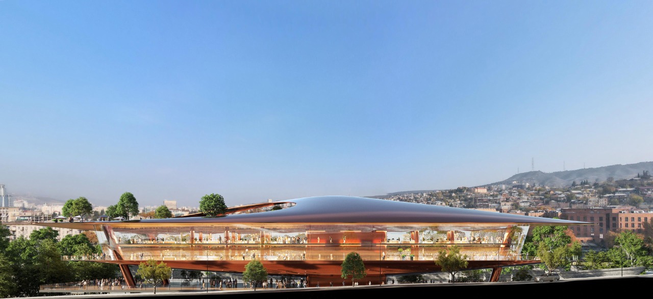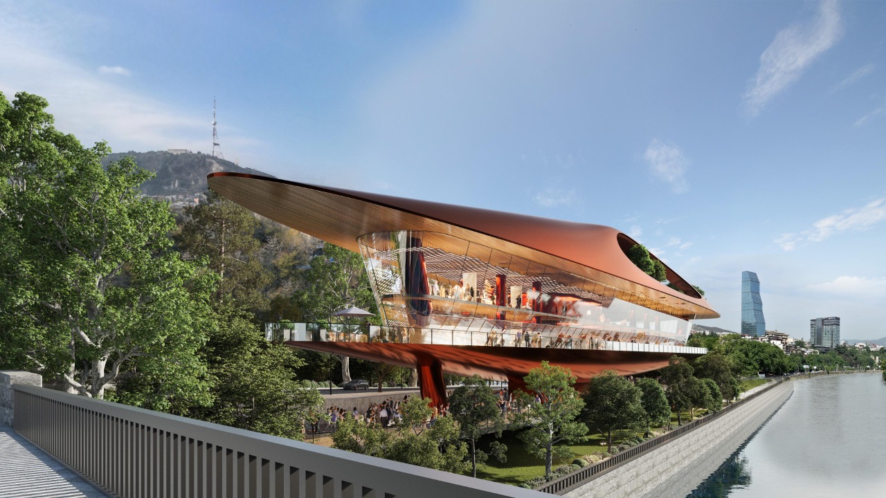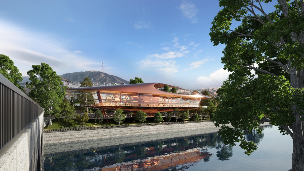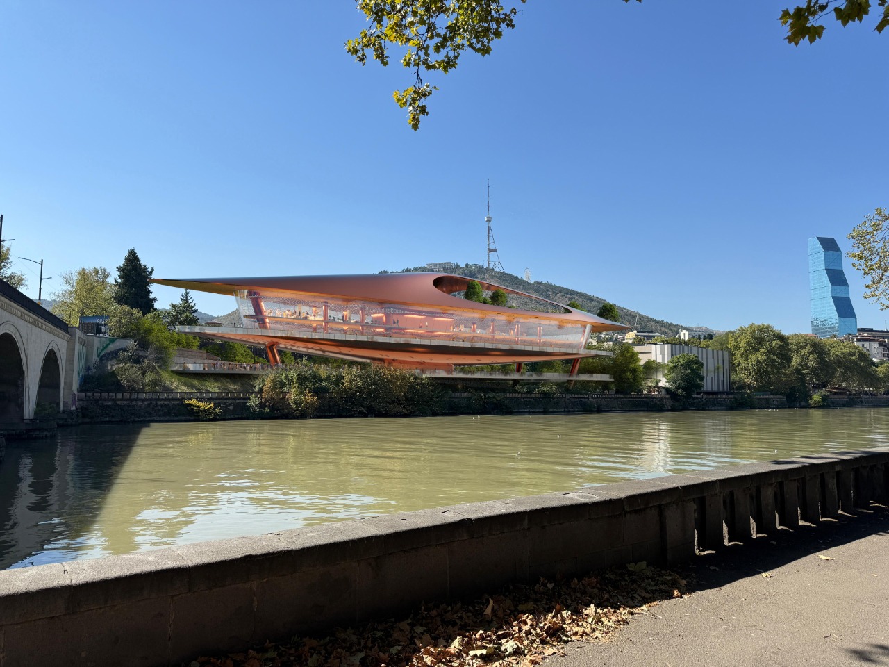 The building is defined by a bold, fluid roof that appears to hover above a transparent and permeable volume. The roof is clad in durable PVDF-coated metal panels, providing a resilient form that responds to riverside climatic conditions, ensures long-term performance with minimal maintenance, and reinforces the building’s visual identity along the Mtkvari River. Extensive glazing dissolves the boundary between interior and exterior, ensuring openness, accessibility, and continuous visual connection to the surrounding cityscape.