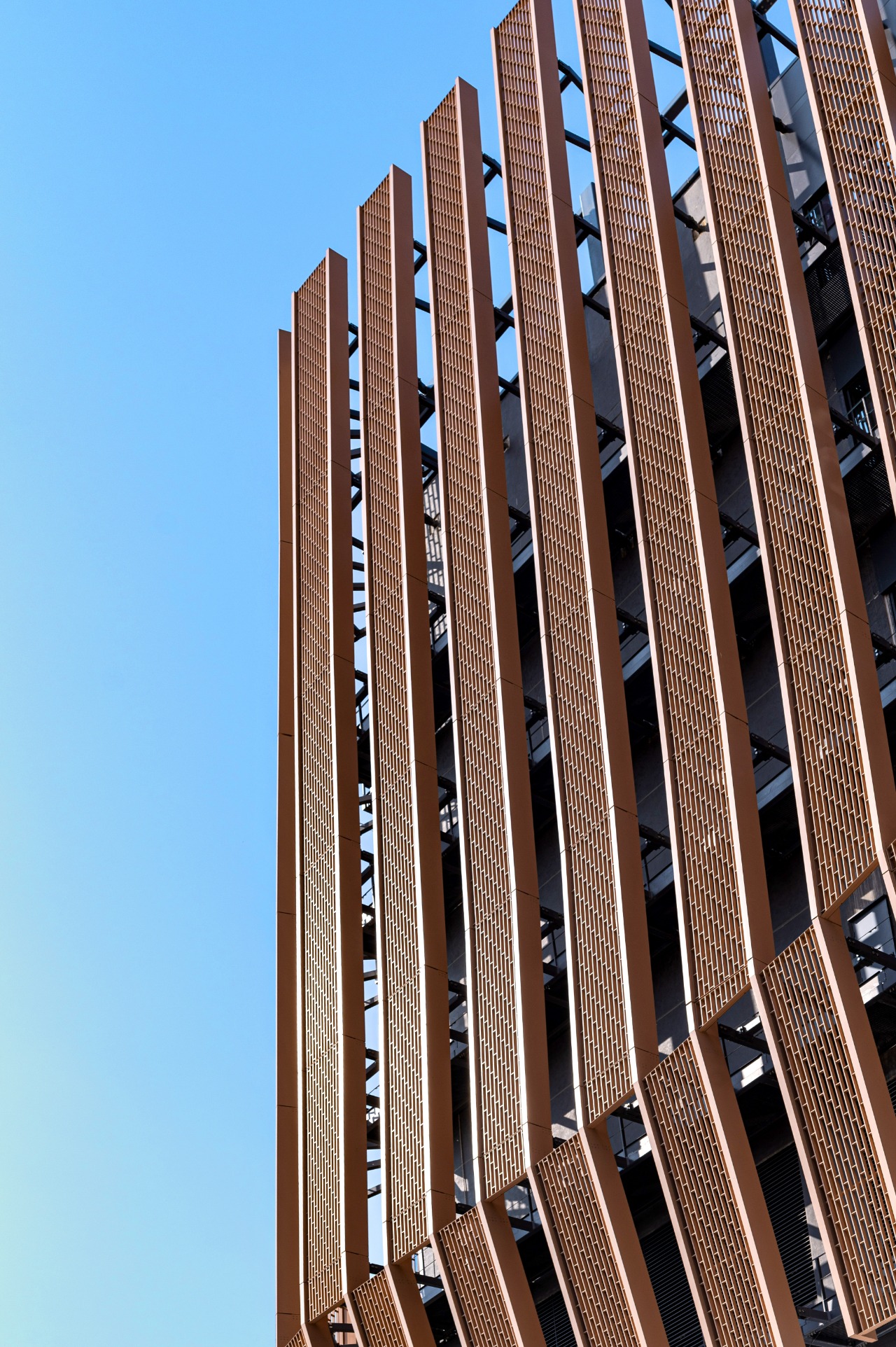 The design is a physical expression of Chinese medicinal philosophy, with Yin-Yang balance and the Five Elements (Wood, Fire, Earth, Metal, Water) informing spatial organization, materiality, and experience. The façade combines articulated aluminium fins, high-performance glazing, and textured GRC panels, while the iconic medicine cabinet (bai zi gui) is reinterpreted as a perforated aluminium “Tao Passageway,” linking interior and exterior circulation.