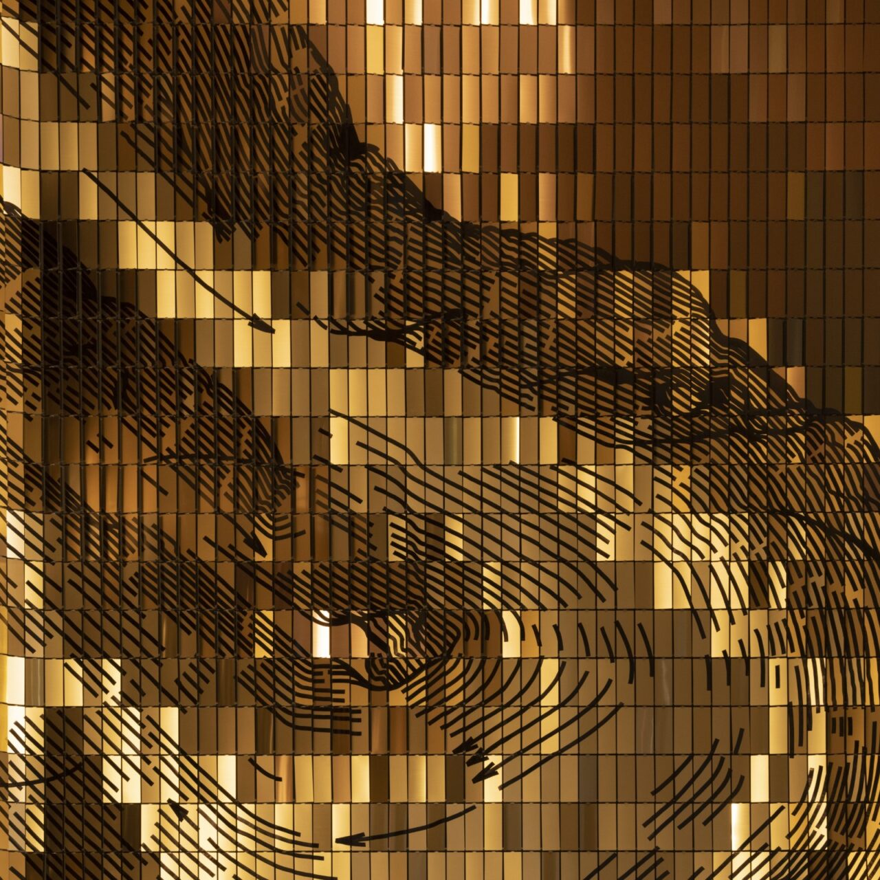 The result is a flowing field of metaphorical light particles. It does not depict light itself, but traces its passage, as if motion had left a visible record suspended within a gold-toned, mirror-like surface. Its visual rhythm recalls murmuration, translated here into thousands of individually angled metal plates that shift with the viewer’s movement.