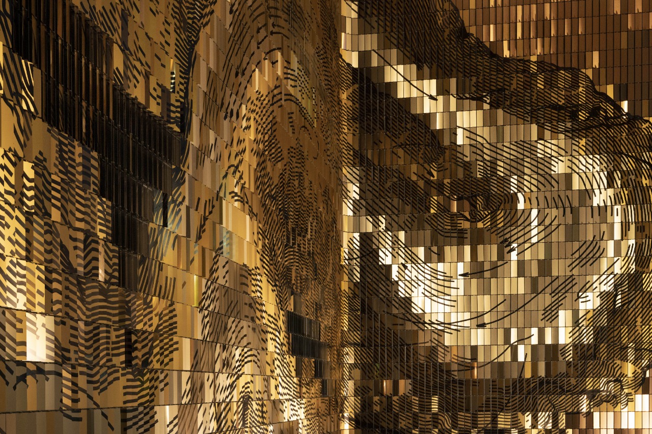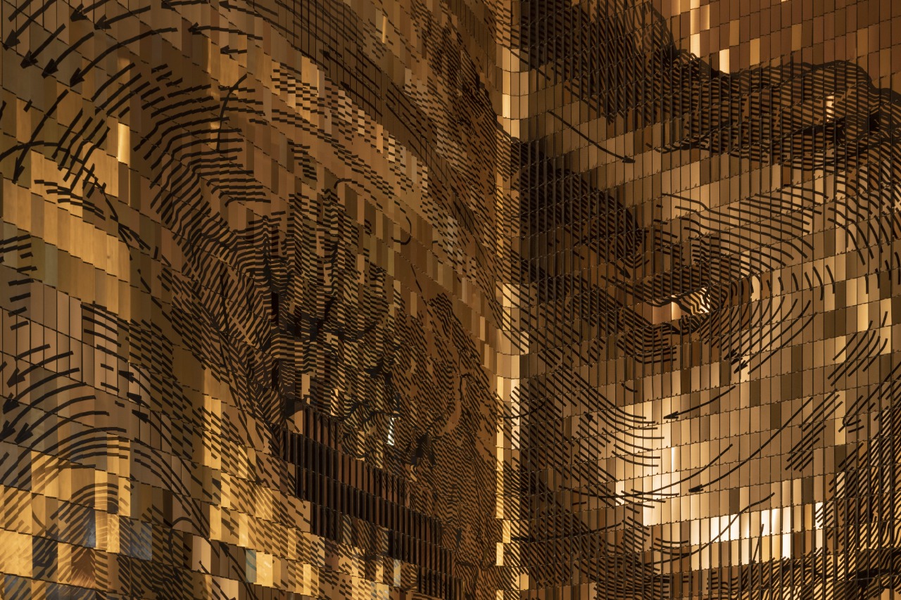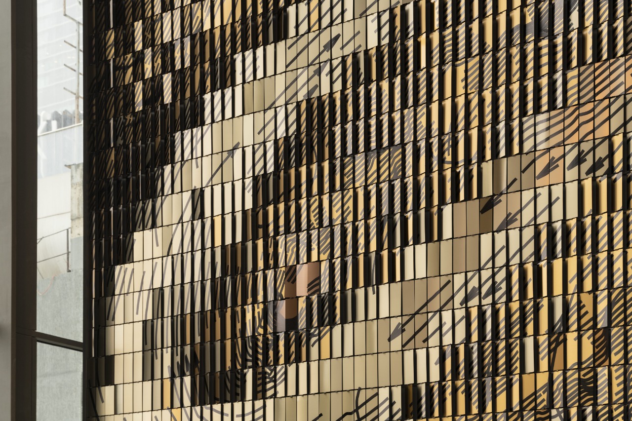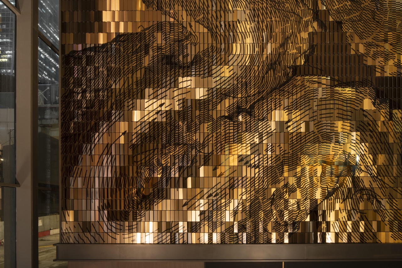 What gives Deus Particula its distinct character is the balance between computation and craft. The parametric system organizes thousands of unique tilt angles and tonal variations, while the artist’s hand-painted graphic layer preserves the presence of the artist’s hand. Different brushing directions and finishes steer light across the surface, turning the metallic field into a canvas shaped equally by engineering and human gesture.