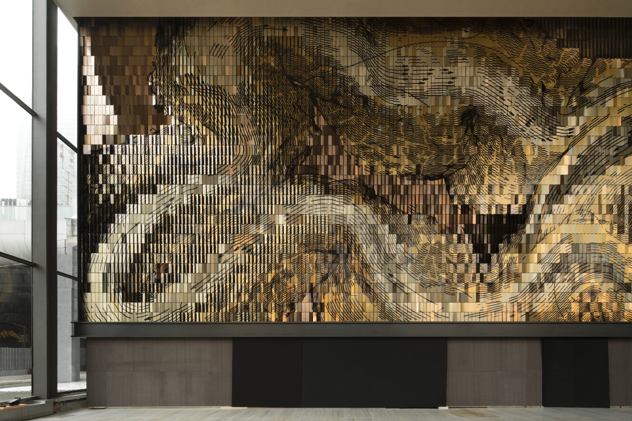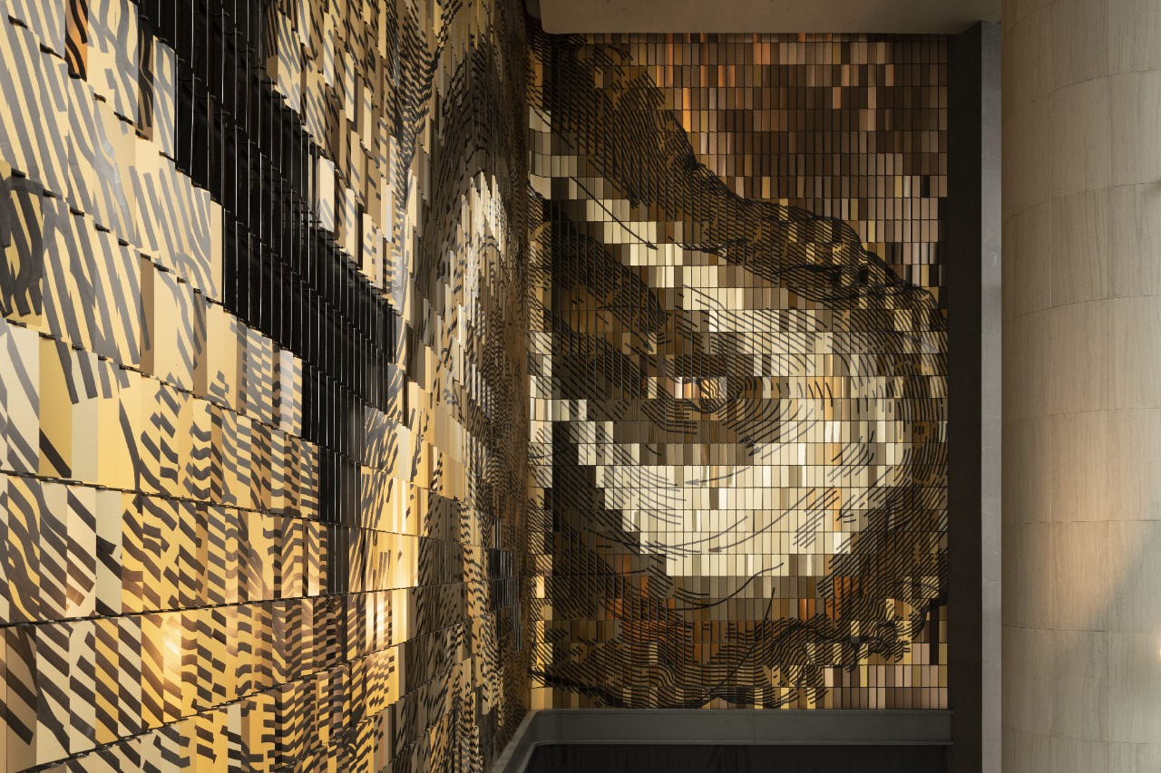 Art curator developed the parametric framework that made the work buildable. Working within a precise set of constraints, the team simulated the particle flow, mapped the composition onto an active parametric model, and tested full-scale mock-ups both in the studio and in the actual lobby. This process ensured that reflection, color, and spatial perception would function as one calibrated system.