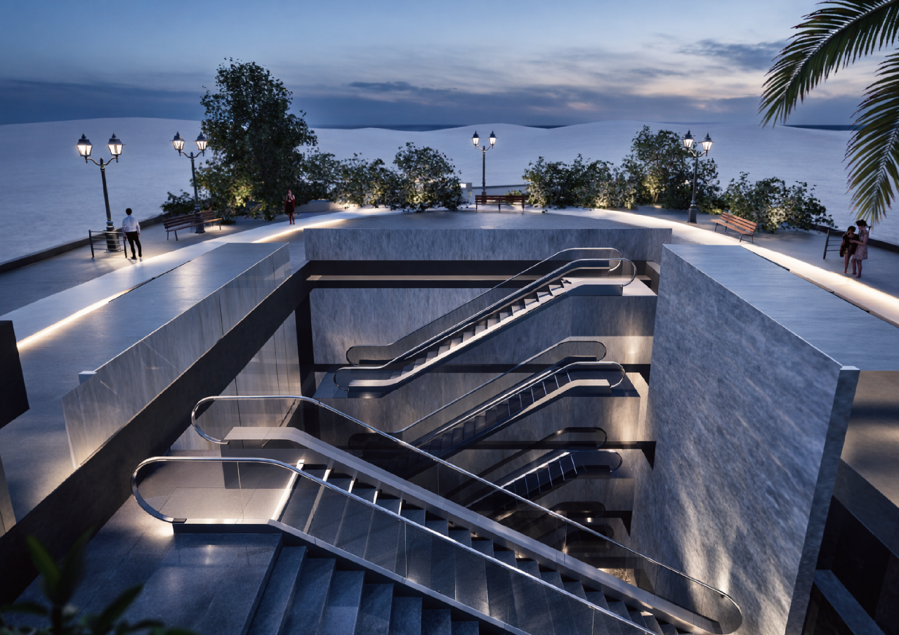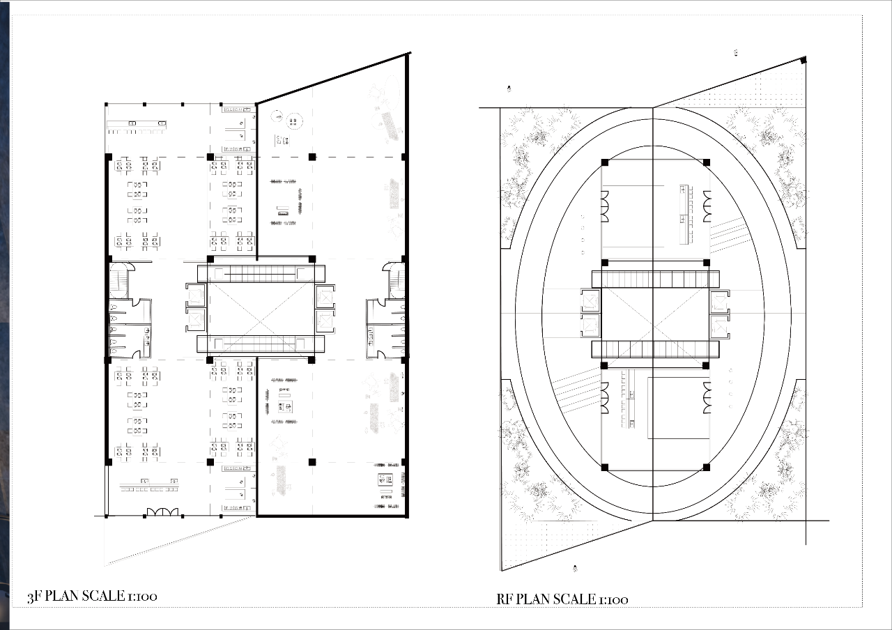 At the rooftop level, circulation converges and the building’s duality becomes fully legible. The two façades, two systems, and two urban interfaces are finally understood as parts of a single architectural whole.