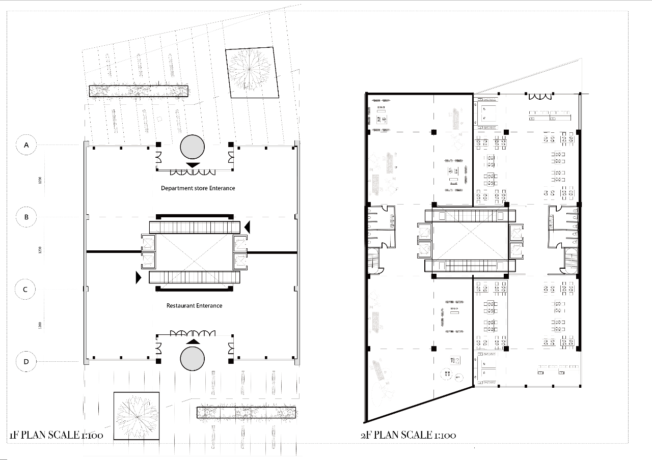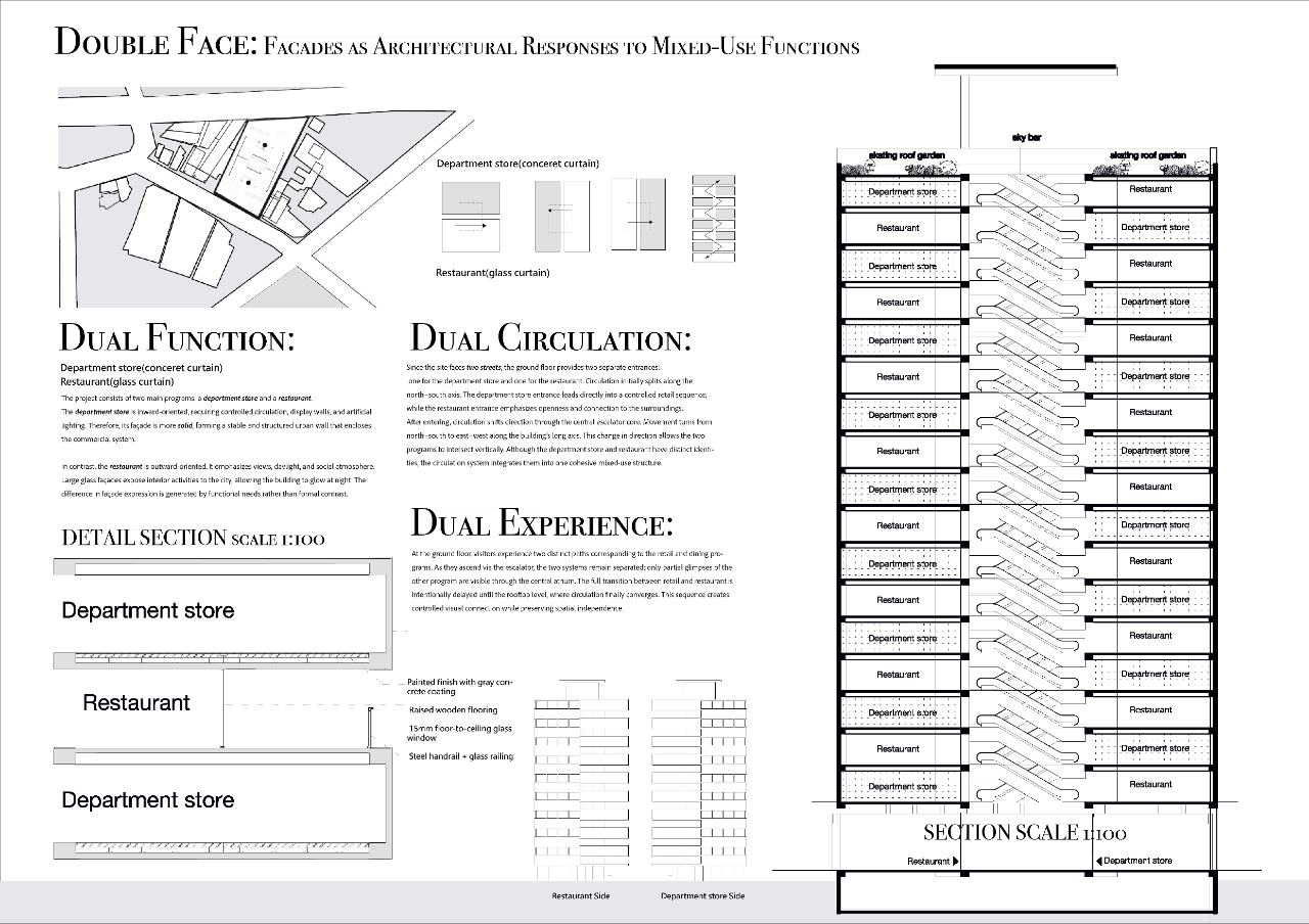 The building consists of two primary programs: a department store and a restaurant. Each requires a different relationship between interior and city. The department store is inward-oriented, relying on controlled circulation, artificial lighting, and curated display environments. In contrast, the restaurant is outward-oriented, emphasizing openness, daylight, and social interaction.