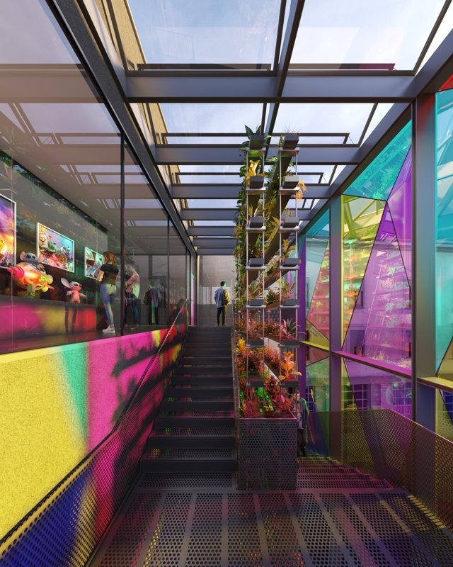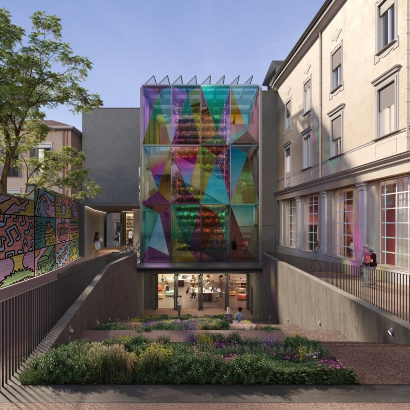 • Bio-Building Machine: a bioclimatic greenhouse integrated into the architecture, functioning as a true “living machine” for the cultivation and production of edible plant species. It uses water collected from the rainwater harvesting system and is enclosed by a distinctive façade featuring triangular, colored glass panels that form a three-dimensional, faceted surface.