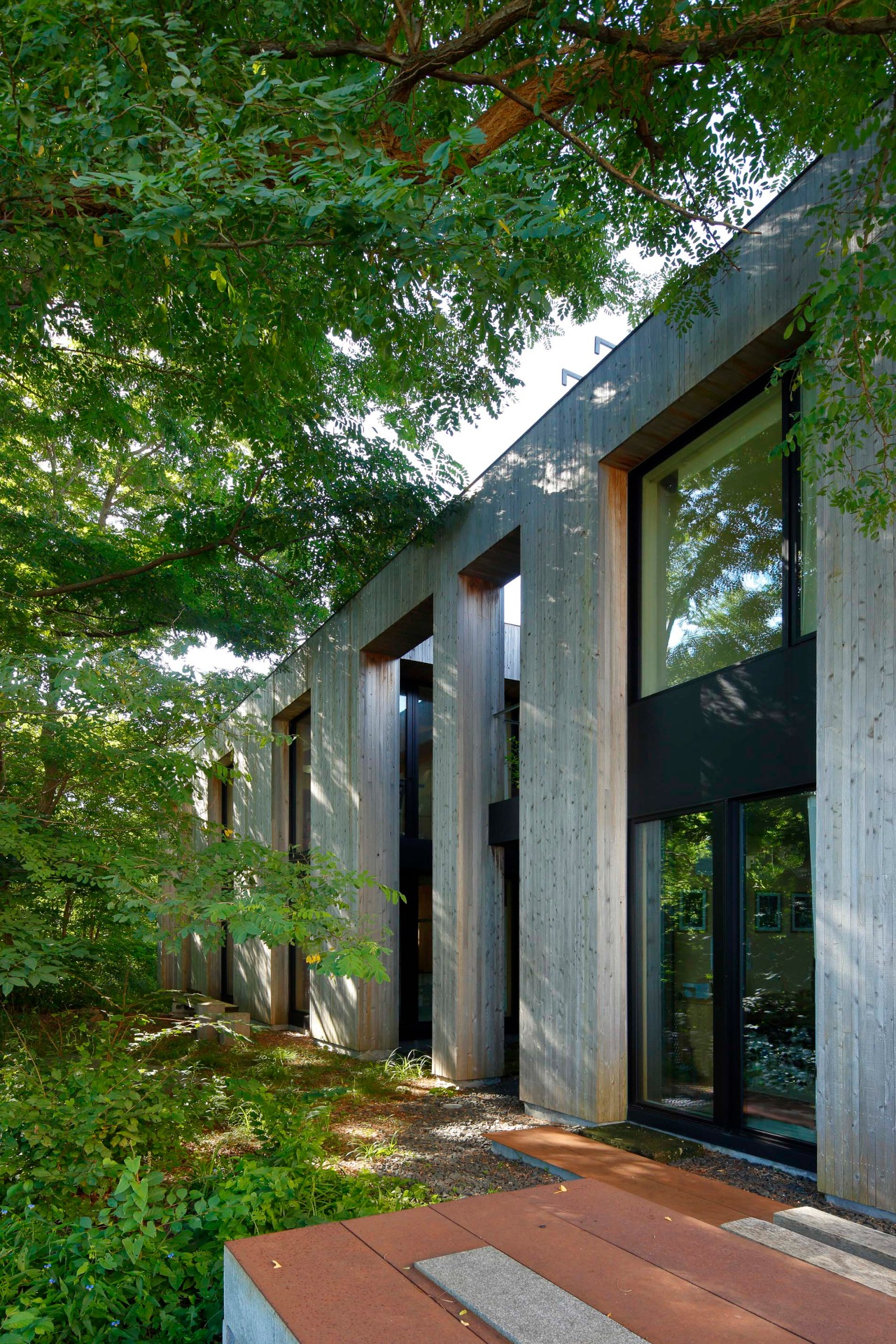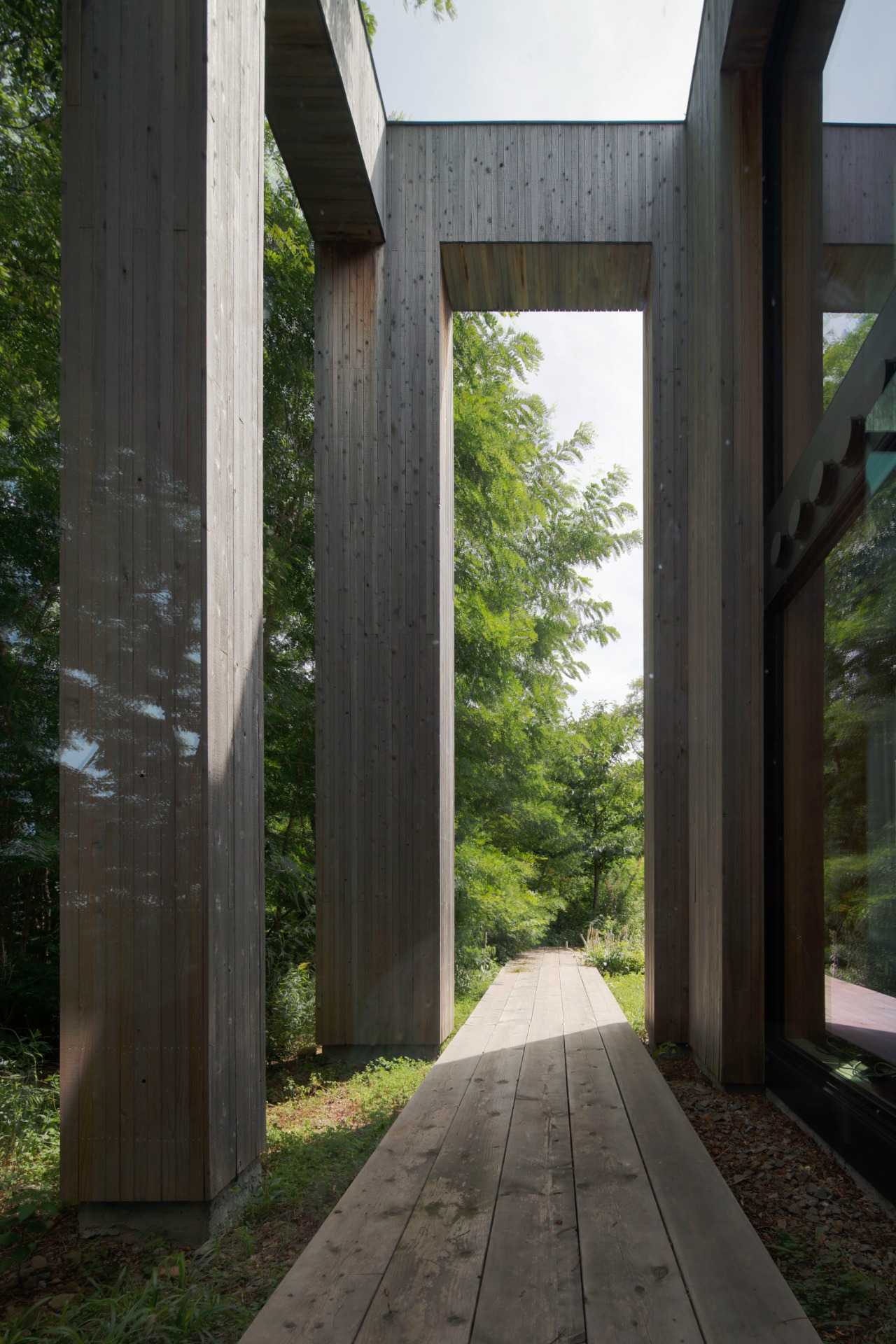 Through repeated walks in the surrounding woods, the design emerged as an abstraction of the forest’s intrinsic order. Instead of literal imitation, the architecture translates verticality, density, layering, and latent rhythm into a geometric composition defined as the “archetype of the forest.” Four parallel structural layers articulated by trunk-like elements establish a silhouette that resonates with the trees along the cliff. The restrained grey exterior conveys resilience against Hokkaido’s severe winds and snow.