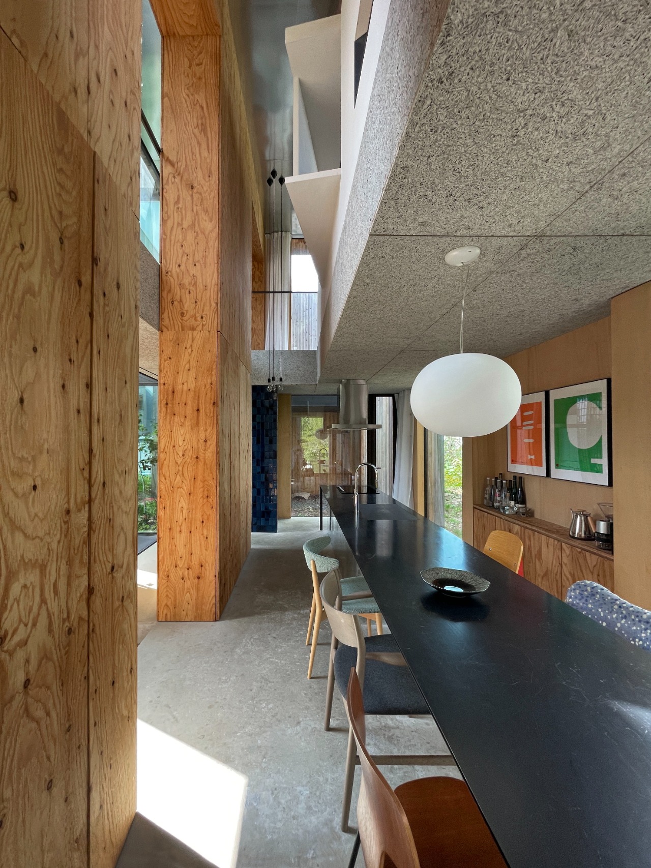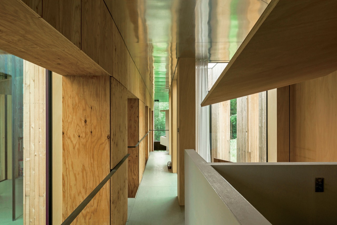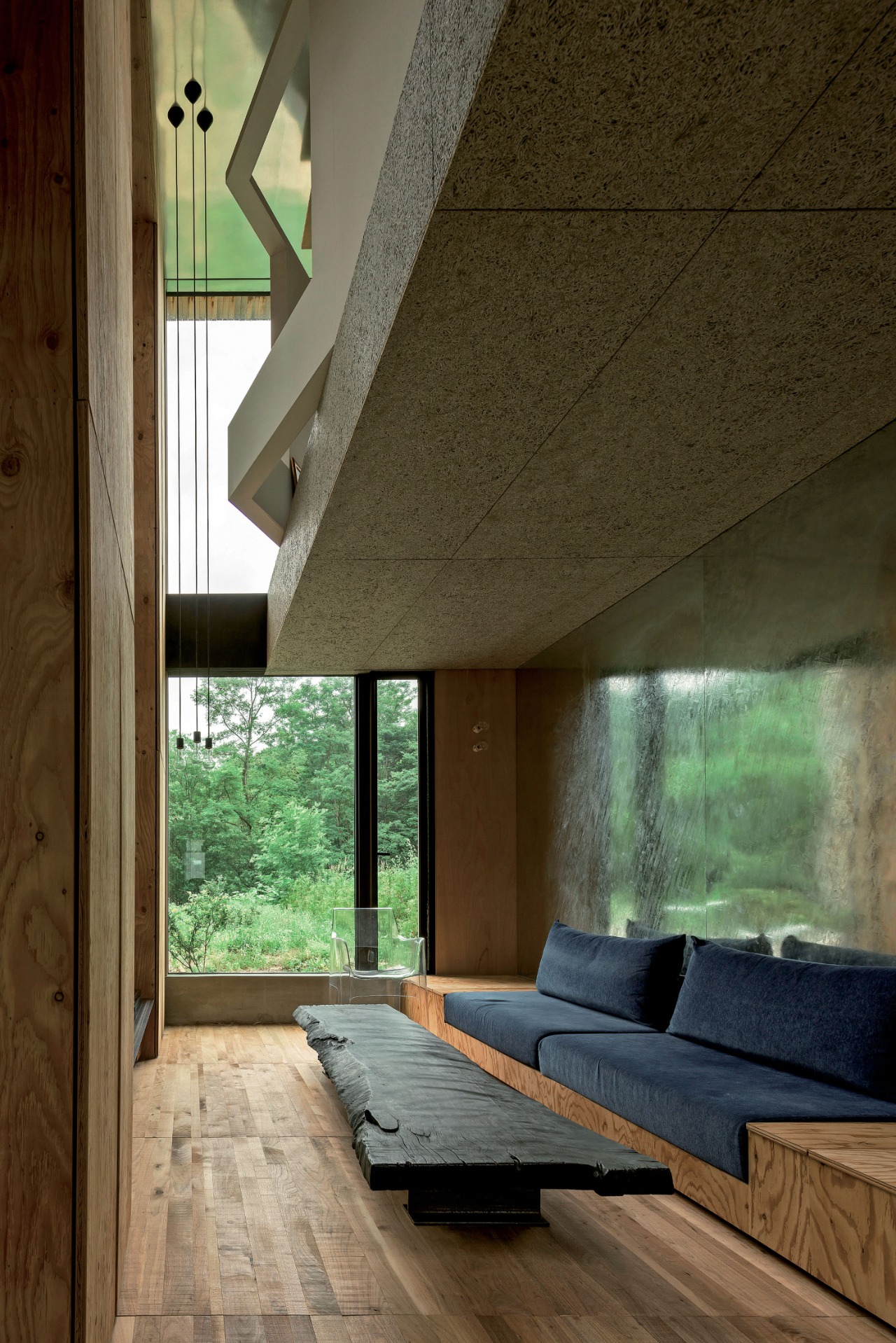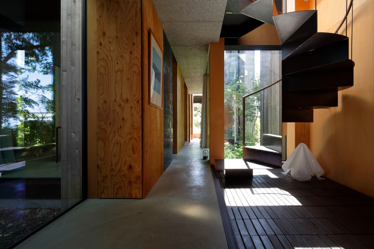 The interior unfolds as a continuous spatial sequence rather than a series of enclosed rooms. A compressed entrance framed by raw concrete walls heightens bodily awareness before the space expands toward a large opening facing the forest. A folded steel spiral stair acts as both circulation and visual axis, sustaining connection between levels.