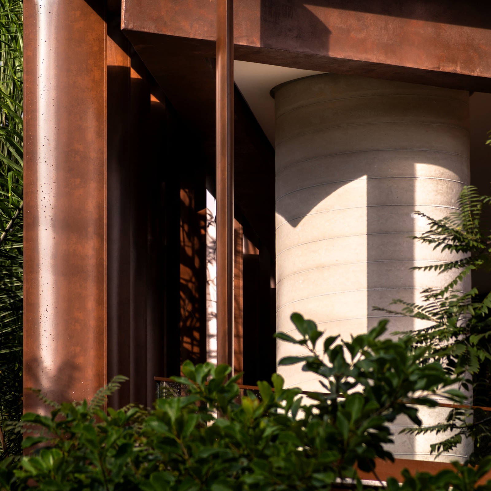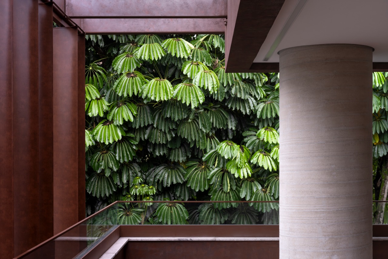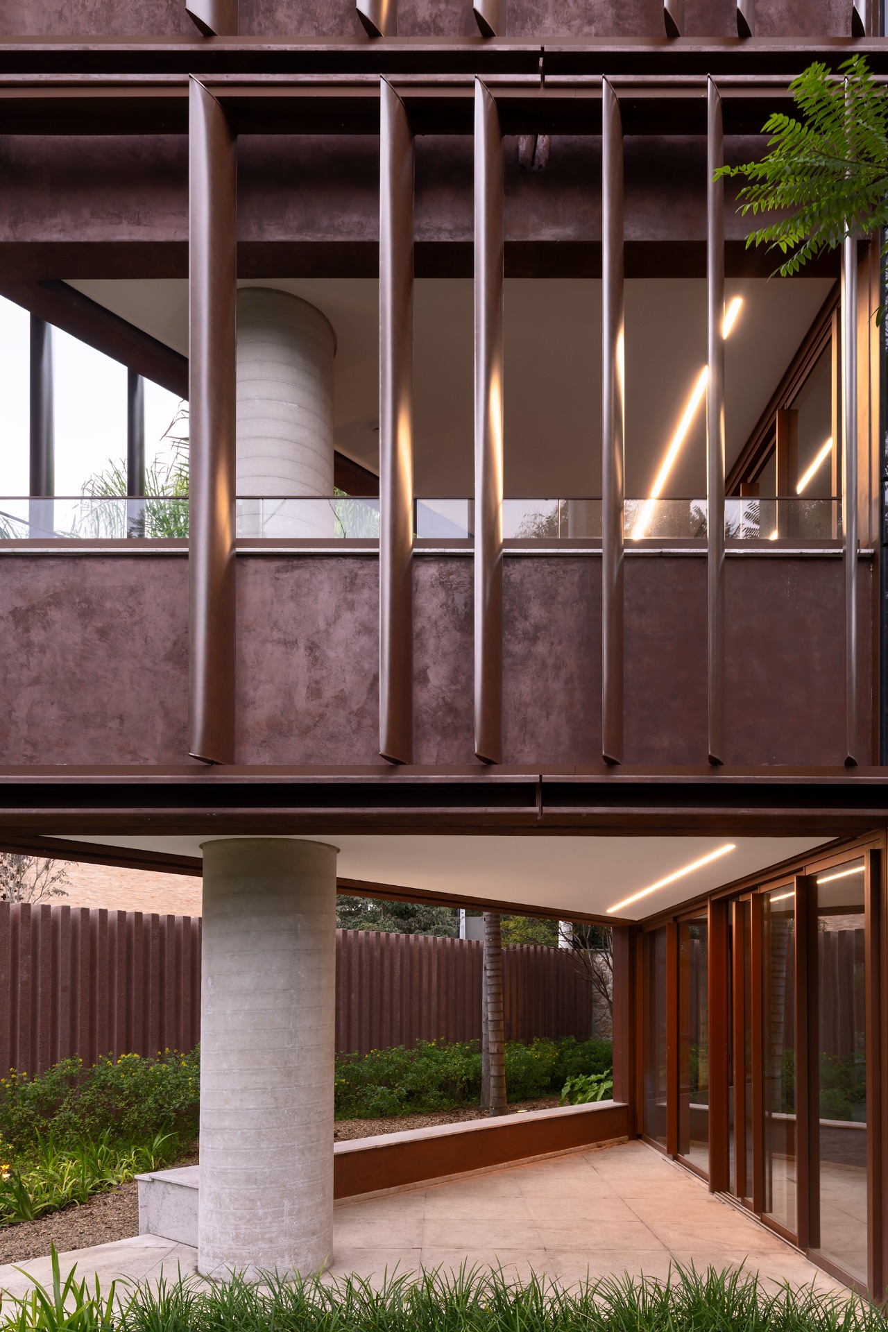 The single-occupancy building is composed of two floors resting on a permeable ground floor, with concrete pilotis and glass panels that reinforce the connection between the interior and exterior, elegant design and abundant landscaping. The large slabs – free of structural interruptions – offer flexibility for occupation and interaction with the vegetation that surrounds the building, without giving up privacy, guaranteed by the Corten steel brise-soleils, which also mark the limit with the sidewalk, in a composition complemented by the soft stone walls, which lend organicity (and Brazilianness) to the timeless volume.