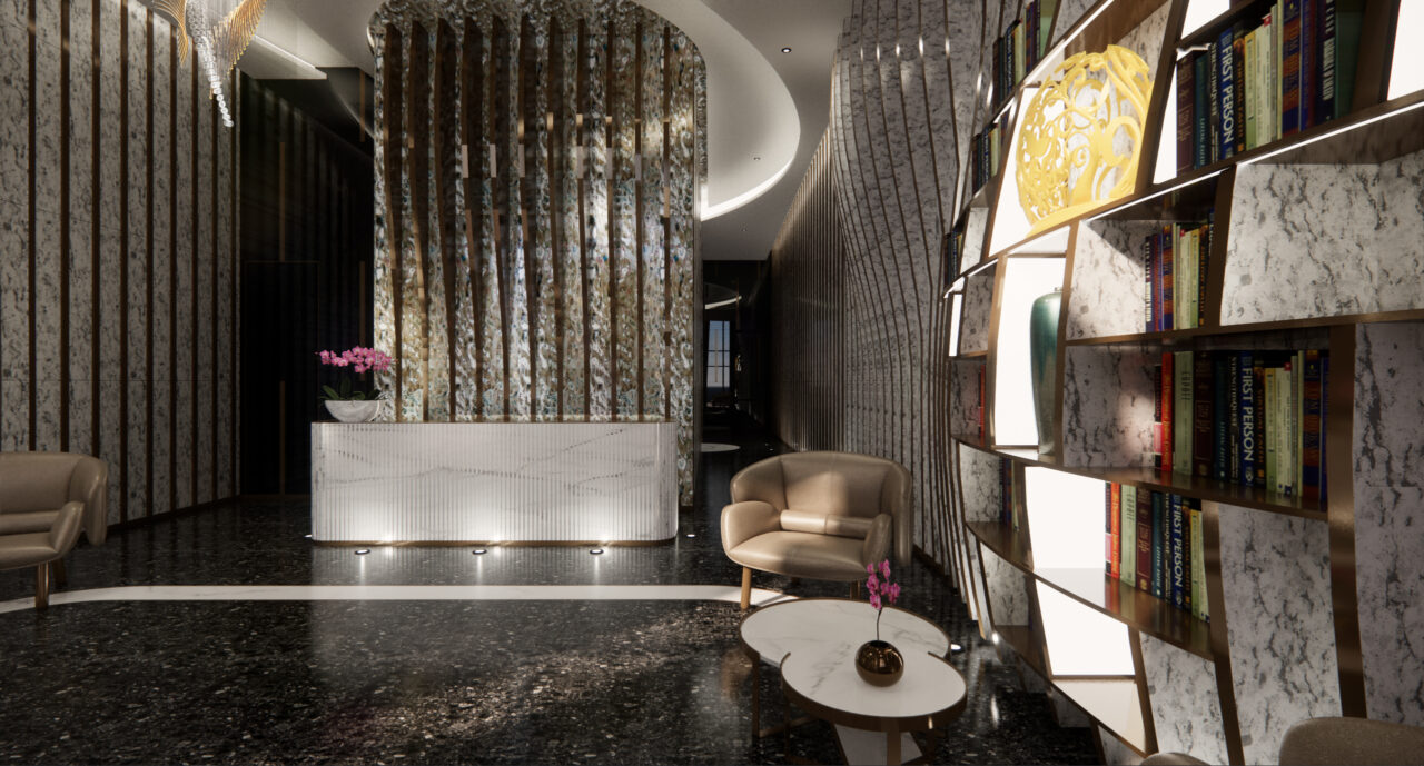 In the detailed design, the waterfalls at the entrance drive microclimate circulation, enhancing comfort visually and functionally. The first-floor lobby features metal plates combined with stone paint. Through 3D curved construction, it presents a layered, three-dimensional flow. The custom-made glazed chandelier further complements the vibrant vibe.