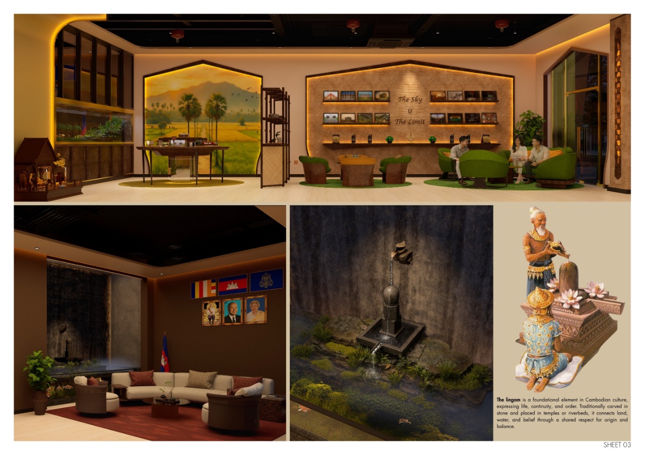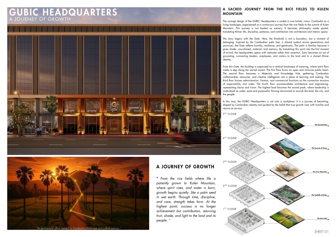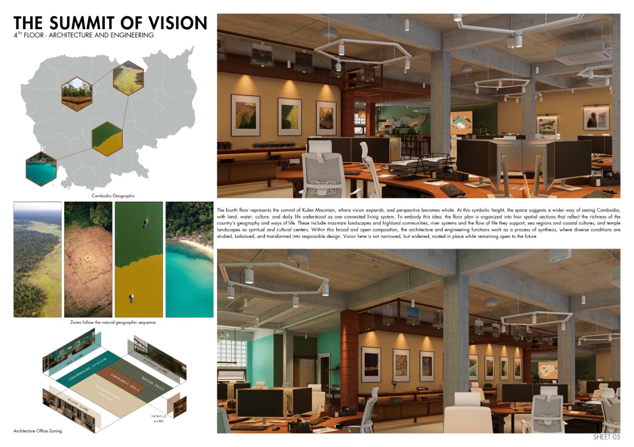This journey is translated into space. The ground floor reflects the rice field, open, calm, and welcoming, a place of connection and beginning. The second floor marks the foot of the mountain, where knowledge forms and direction emerges. The third floor represents the middle, where discipline and responsibility define daily work. The fourth floor reaches the summit, where creativity expands and Cambodia is expressed through four elemental landscapes, temple, mountain, river, and ocean, united as one identity. The fifth floor is the return, where leadership reflects with clarity and purpose.