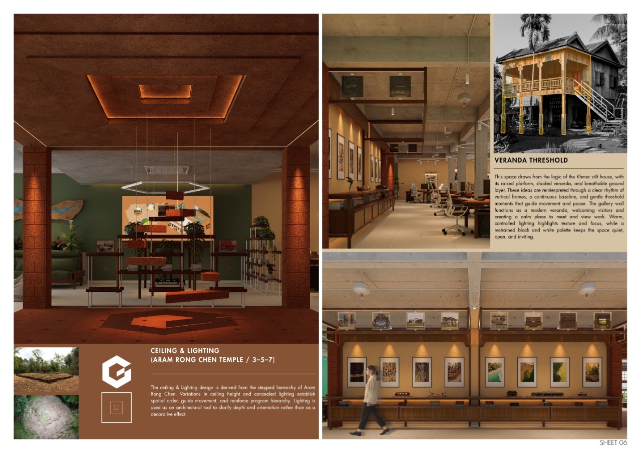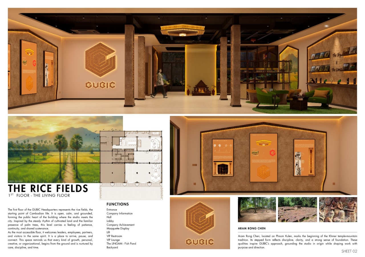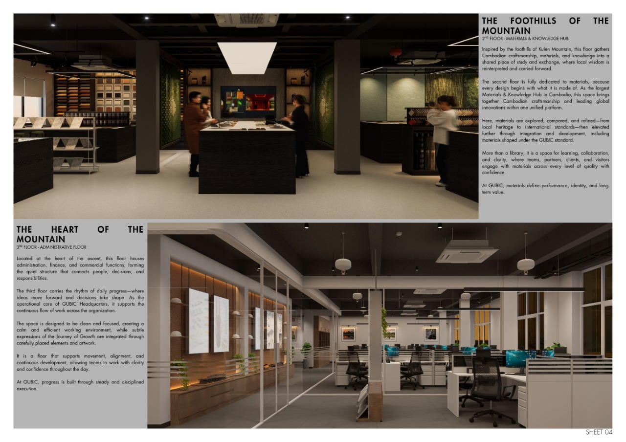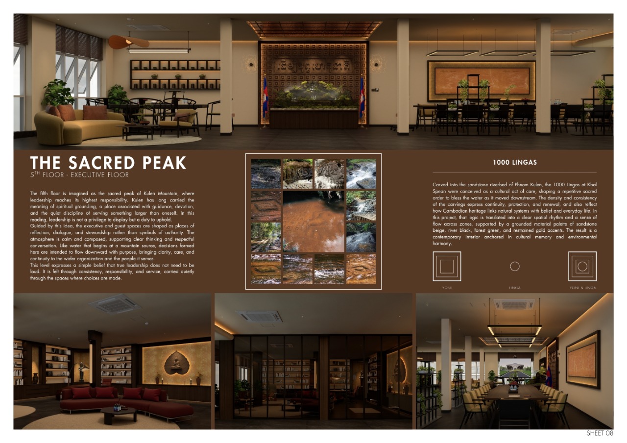 This journey is translated into space. The ground floor reflects the rice field, open, calm, and welcoming, a place of connection and beginning. The second floor marks the foot of the mountain, where knowledge forms and direction emerges. The third floor represents the middle, where discipline and responsibility define daily work. The fourth floor reaches the summit, where creativity expands and Cambodia is expressed through four elemental landscapes, temple, mountain, river, and ocean, united as one identity. The fifth floor is the return, where leadership reflects with clarity and purpose.