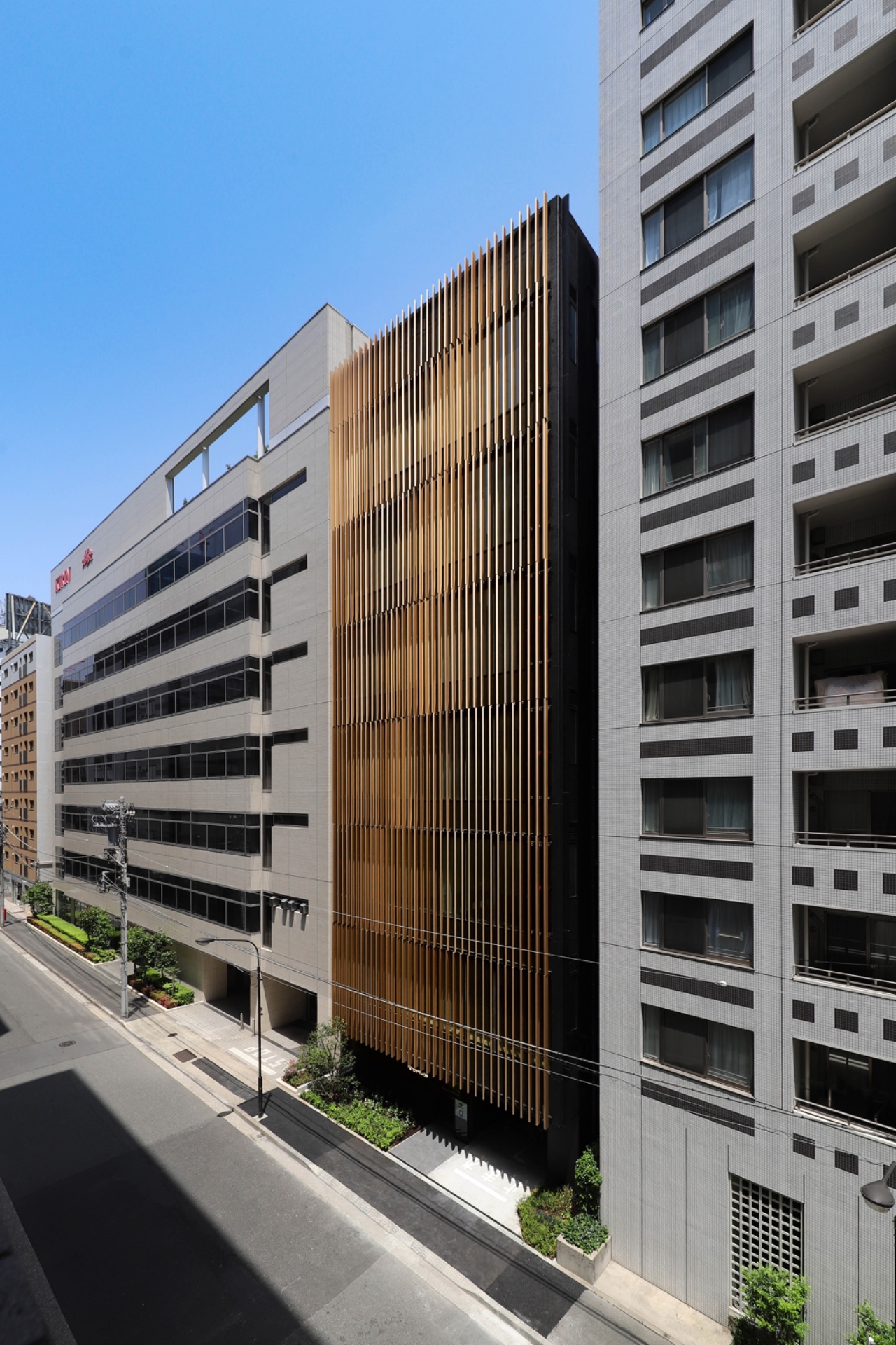 The building is a seven-story reinforced concrete structure with a slender form, organized around a central light court that brings daylight and natural ventilation into the interiors. The walls of this court are finished in “Higeta Yellow,” so that light and color permeate rooms, subtly infusing the workplace with symbolic vibrancy. The entrance hall features a narrow slit of yellow light, a symbolic incision that evokes both historical depth and forward momentum. Together, these spatial elements create a dynamic experience of tradition and innovation.