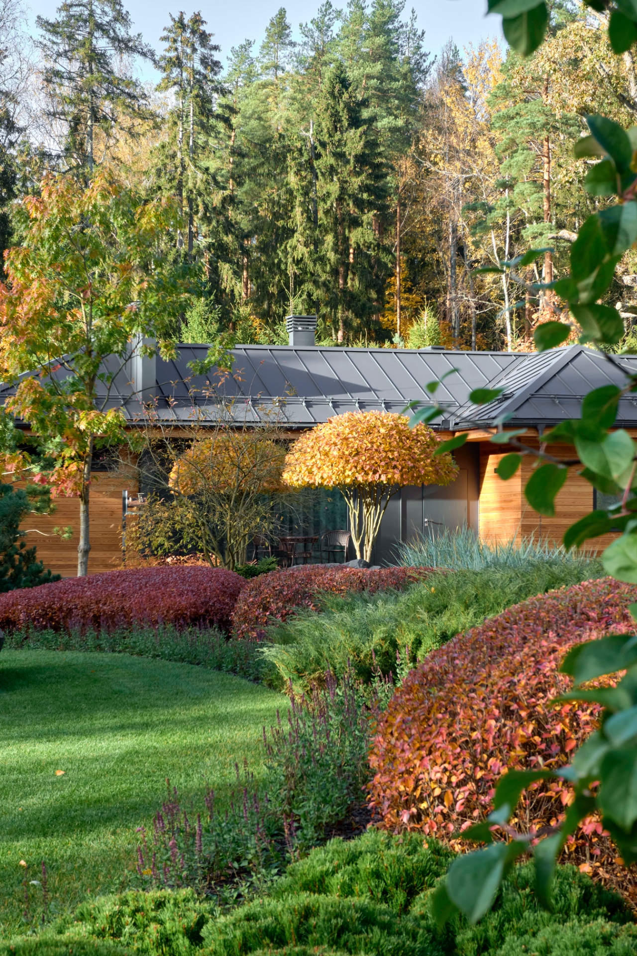 This landscape features local plants and unique exotics. They were selected delicately to avoid putting the surrounding environment at risk. For instance, we found a suitable beech from a collector, grown in the northwestern region. The island Korean mountain ash Dodong with its incredibly bright red foliage was brought adapted from Sweden.