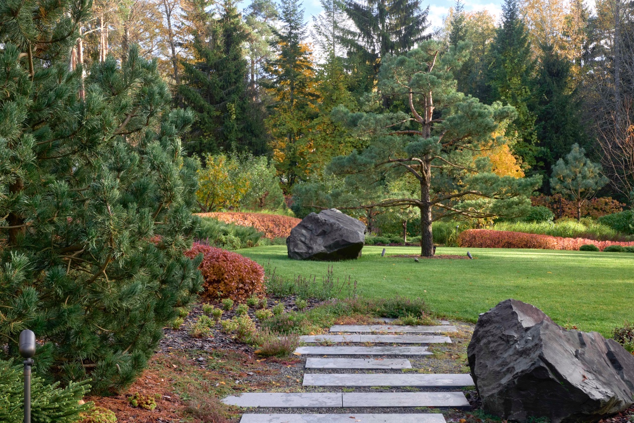 The shady forest encounters a sunny lawn. Brutal stones with a weightless cloud of grasses. Color appears not only in flowers. The garden is beautiful in autumn too, with the emergence of a new palette of ochre, brown, yellow branches and roots, needles and seed pods, stones and earth.