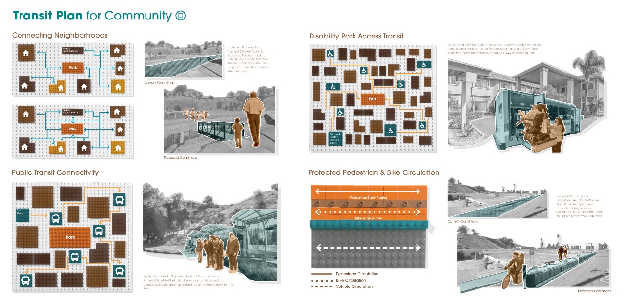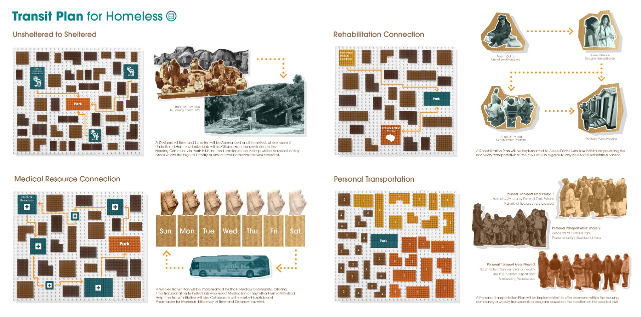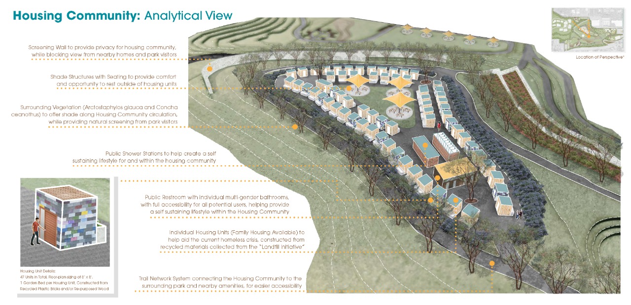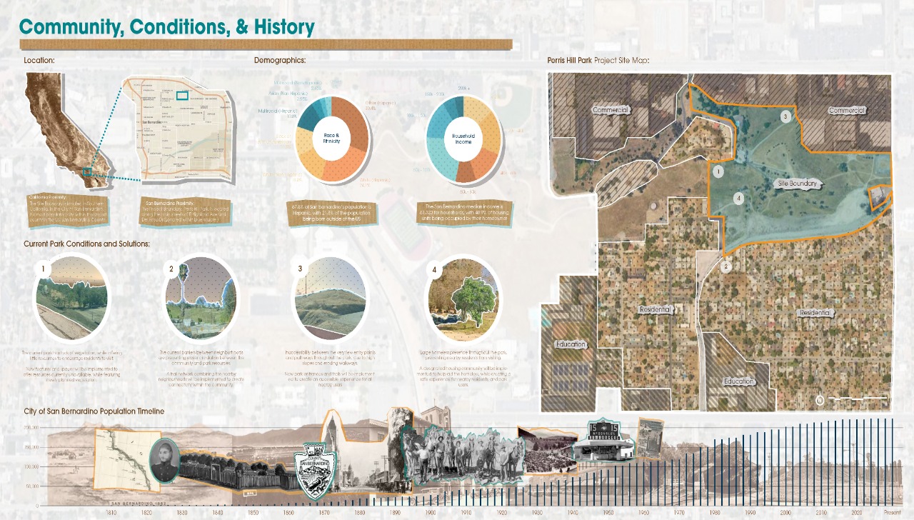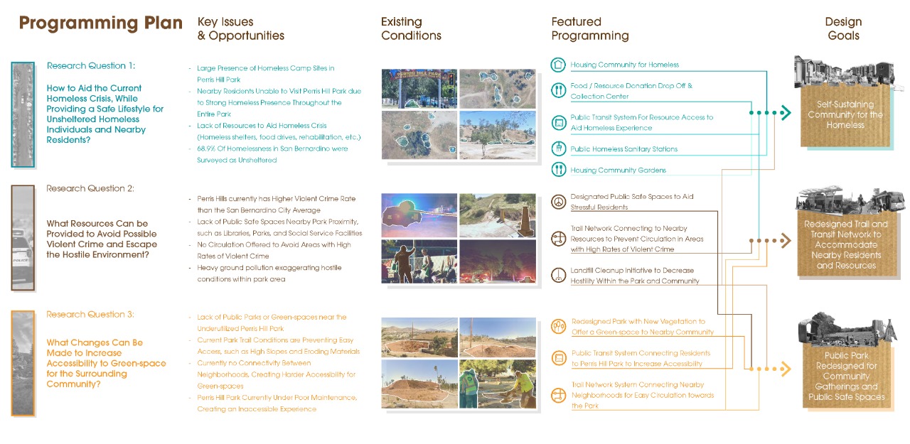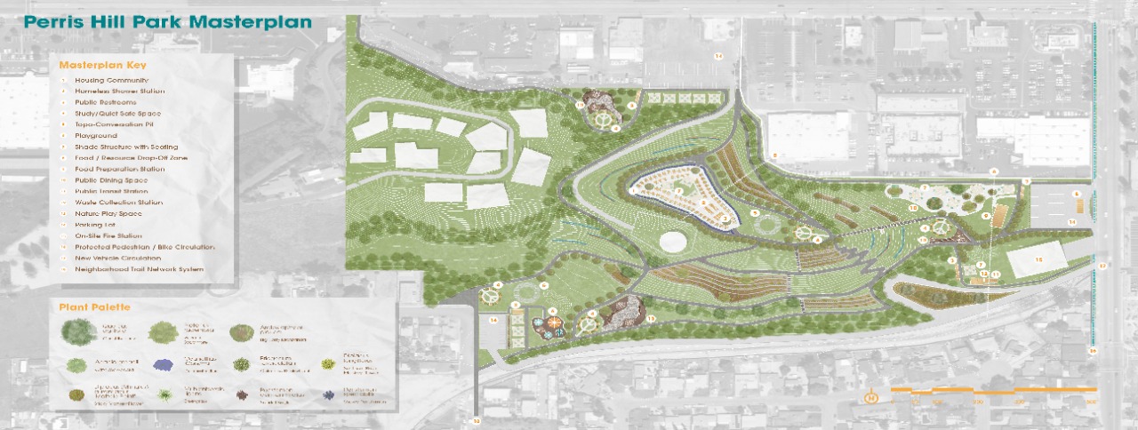 The City of San Bernardino has become one of California’s hot-spots in regards to homelessness and crime. The once thriving city has now become a common area of stress and danger. With conditions continuing to worsen, a more practical approach has been designed, focused on healing the city’s key issues, while setting a design standard for cities with similar concerns. The historical and now nearly abandoned Perris Hill Park is now occupied by homeless camps. “Humane Practicality” redesigns the park to maximize the use of this historically important San Bernardino park.