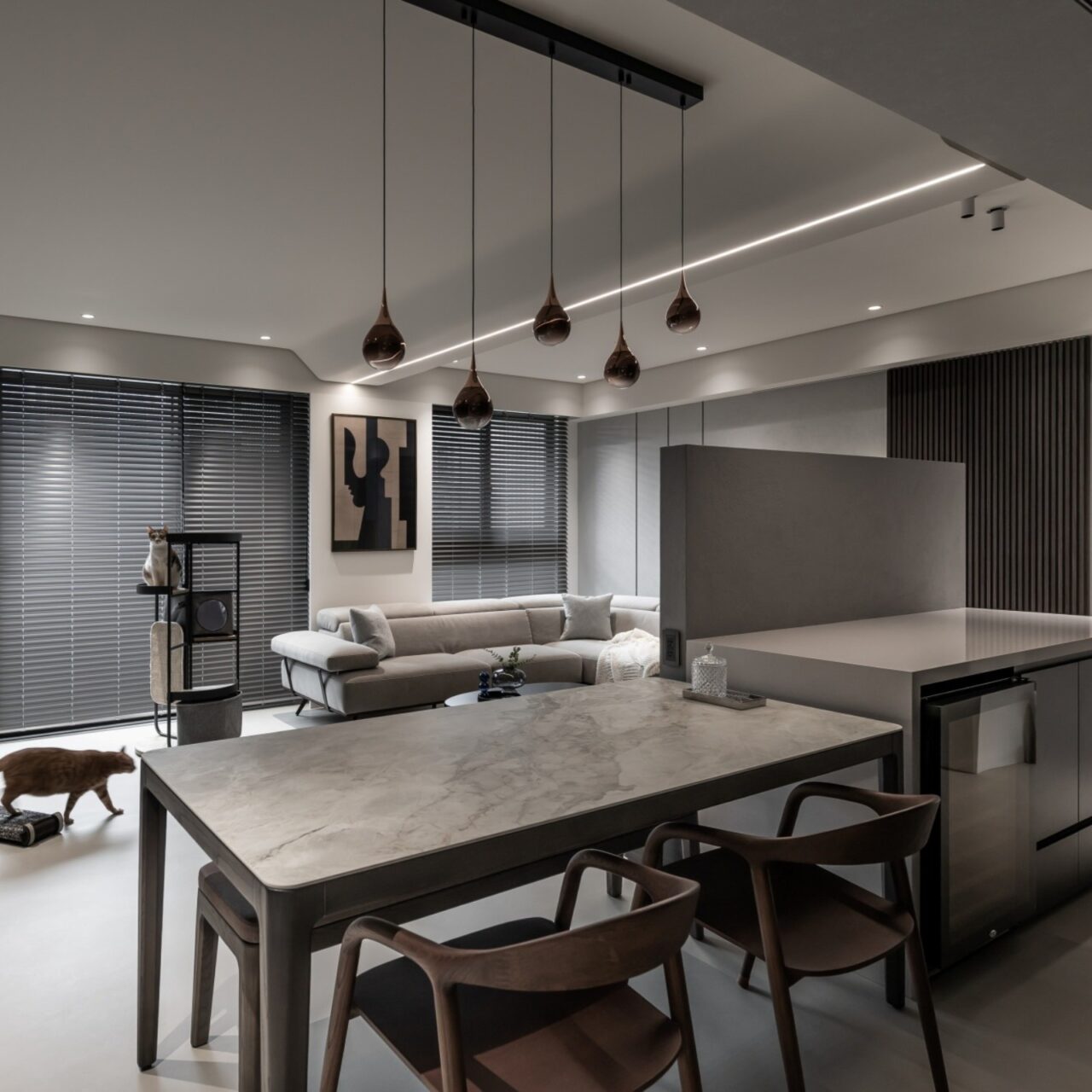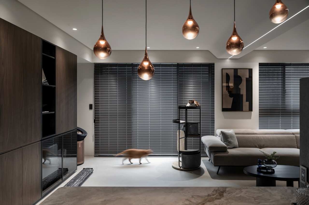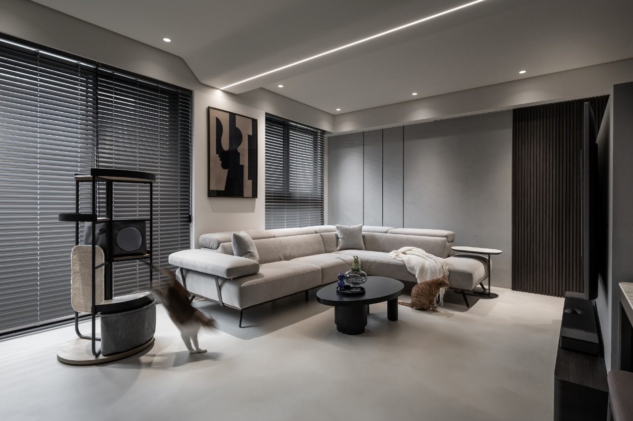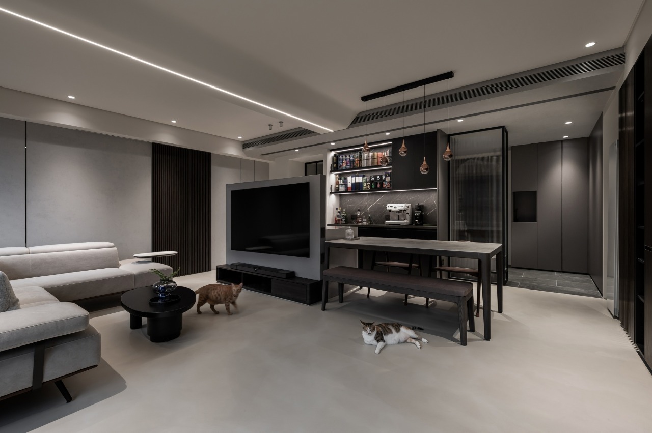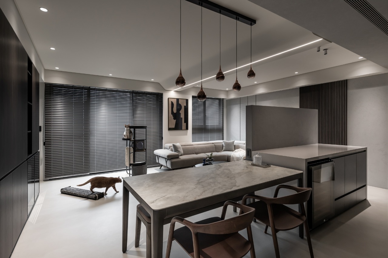 By blending the dining room and living room into one cohesive space, the abode gains a sense of openness and effortless flow. This open-plan layout redefines the spatial order of the public domain through functional reorganization and reorientation of spatial volumes. Muted tones restore visual clarity, redirecting attention to the interactions between people and the bonds shared with their pet. Grounded in shades of gray, the interplay of materials and linear illumination lends depth to the space, culminating in a serene residence that counters the chaos, stress, and anxiety of urban life.