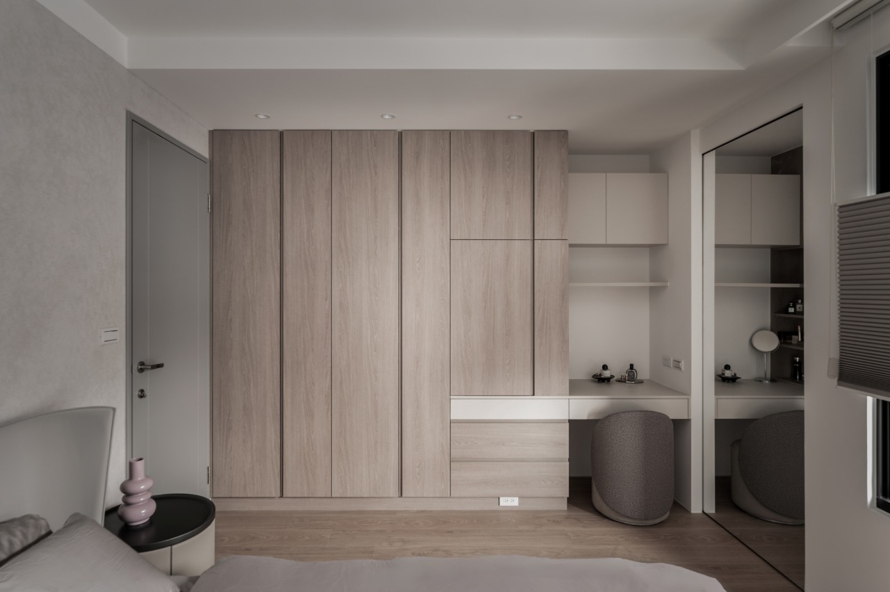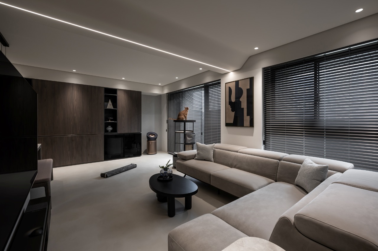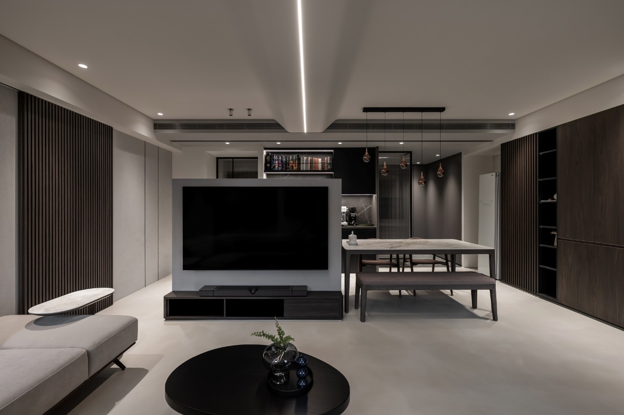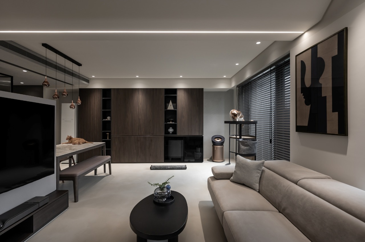 Within the open-plan framework, the primary design challenge lies in balancing visual transparency with clearly defined spatial zones. The TV wall is reoriented to serve not only as the spatial axis but also as a subtle divider between the living room and dining room. Meanwhile, the original feature wall has been transformed into an integrated storage cabinet, meeting practical needs as well as enhancing overall functionality. The TV wall discreetly conceals objects on the bar countertop, allowing the line of sight to extend naturally toward the wine bottles displayed above the sideboard. Solid-colored surfaces, a stone-patterned wainscoting, and display shelving establish foreground, midground, and background, enhancing the visual depth of the open-plan space. Above the sofa, a low beam is softened with curved detailing and linear lighting, balancing visual weight and creating a smooth transition across the ceiling.