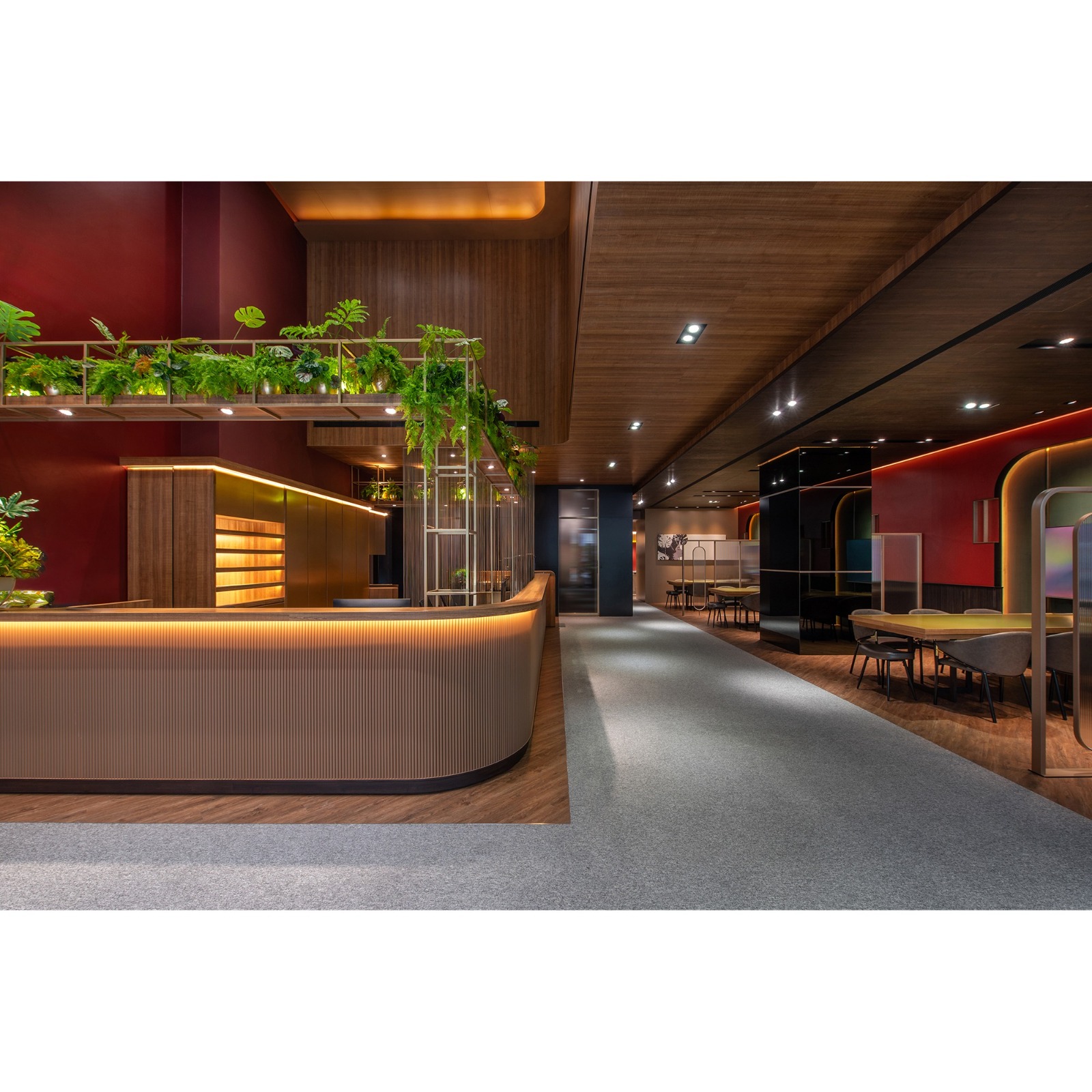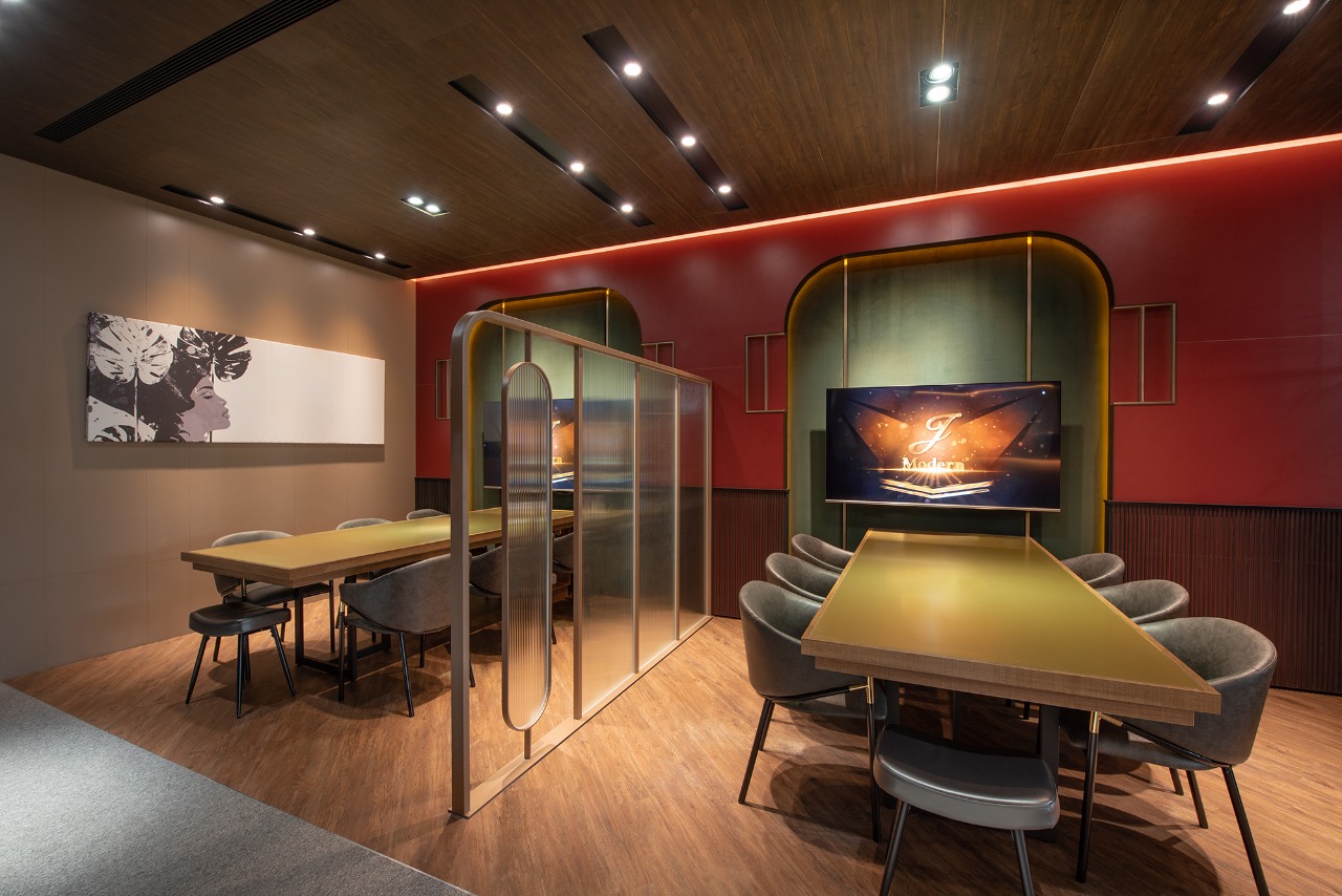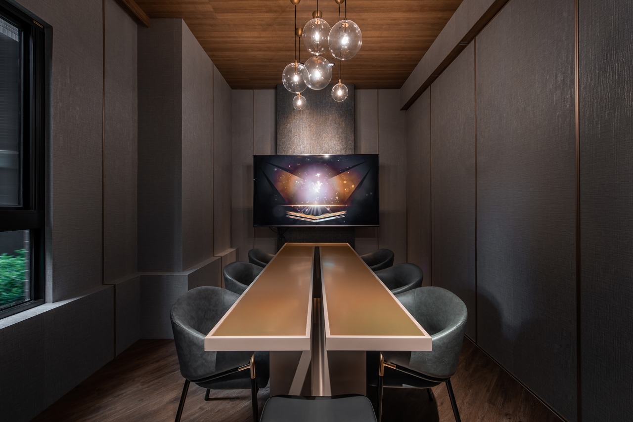 This hospitality space exudes a captivating “1920s Metropolitan Modern” theme, drawing inspiration from the iconic film The Great Gatsby. Rich deep red and dark green hues elegantly intertwine throughout the design, evoking the stylish essence of contemporary New York City. Moreover, the floor plan boasts an open circulation layout, skillfully complemented by semi-transparent partitions that not only ensure visual continuity but also provide a delicate balance between functional flexibility and conversational privacy. In addition, the meticulous integration of layered lighting and a harmonious material palette unifies the reception, waiting, and meeting (discussion) zones, allowing them to flow together seamlessly. This thoughtful design strategy not only reinforces the brand’s stable image but also enhances users’ sense of comfort and encourages them to linger and engage within the space.