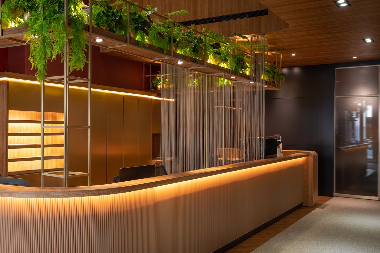 Layered indirect lighting, strategically placed, further elevates the vertical sense of space, casting a warm, inviting glow throughout the area. The counter itself boasts an intricate three-dimensional grid design that is both recessed and embedded with linear lighting, enhancing its modern sophistication. In addition, the geometric metal plant stand above introduces a touch of greenery, softening the business atmosphere with its refreshing presence and the captivating interplay of light and shadow. At the end of the counter, a high-backed bar seamlessly extends, artfully blurring the lines between the reception area and a more relaxed leisure space.