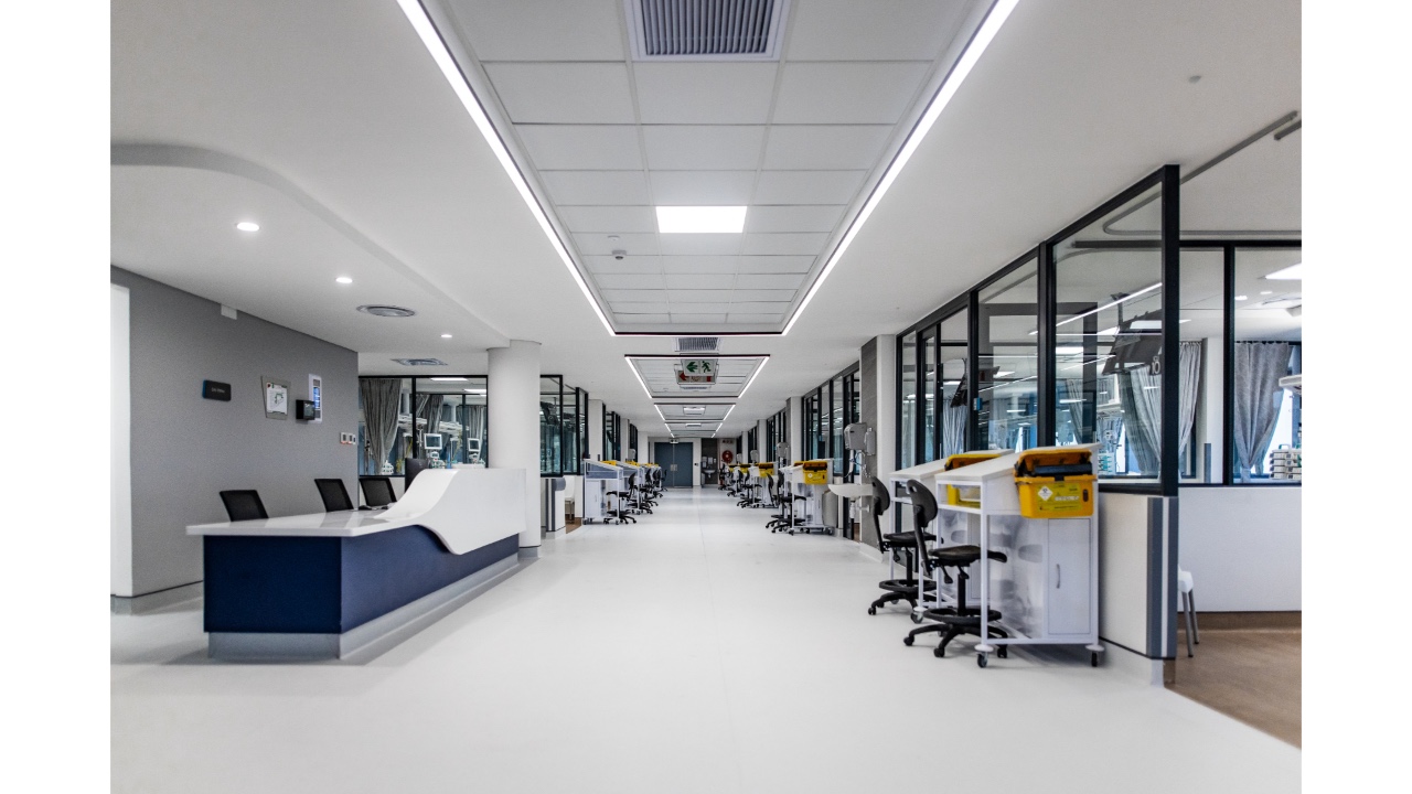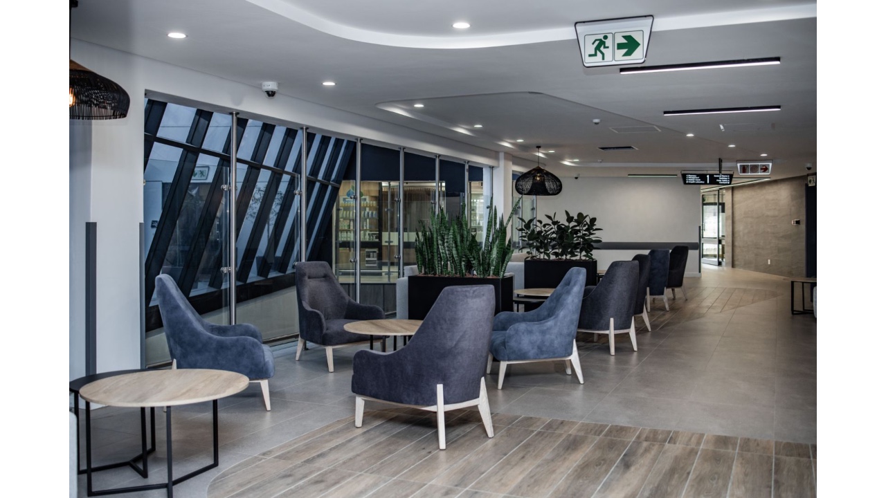 Sustainability measures include double-glazed performance glass on the north façade to reduce heat load and road noise, single-glazed performance glass to the south, and a north/south building orientation to limit low-angle sun penetration. An extensive solar panel and battery system reduces grid energy load and provides emergency backup power. The project was delivered on a strictly managed budget with all design elements optimised for cost efficiency. Full compliance with R158 regulations, governing buildings, equipment, and infection control, was maintained throughout.