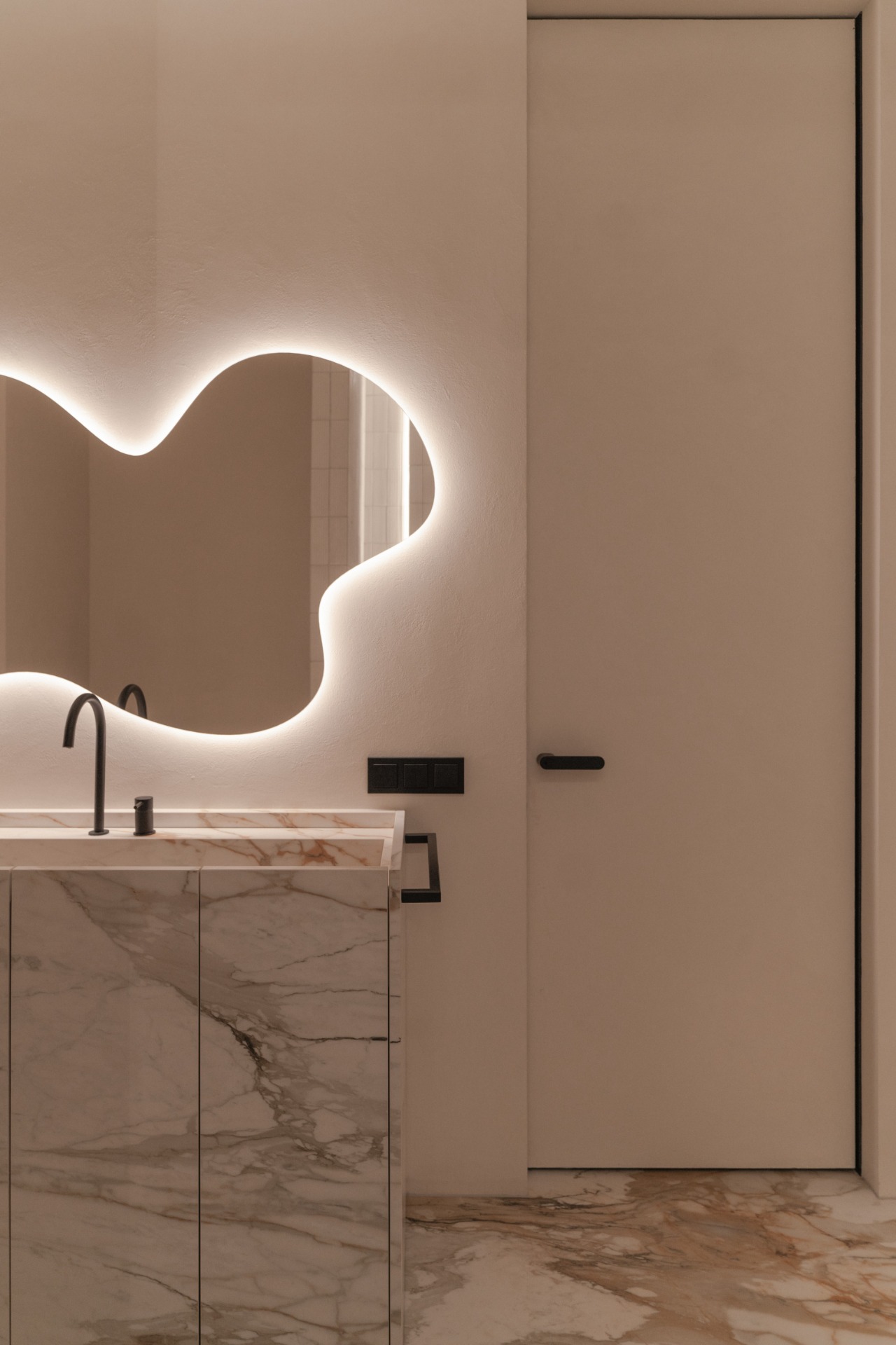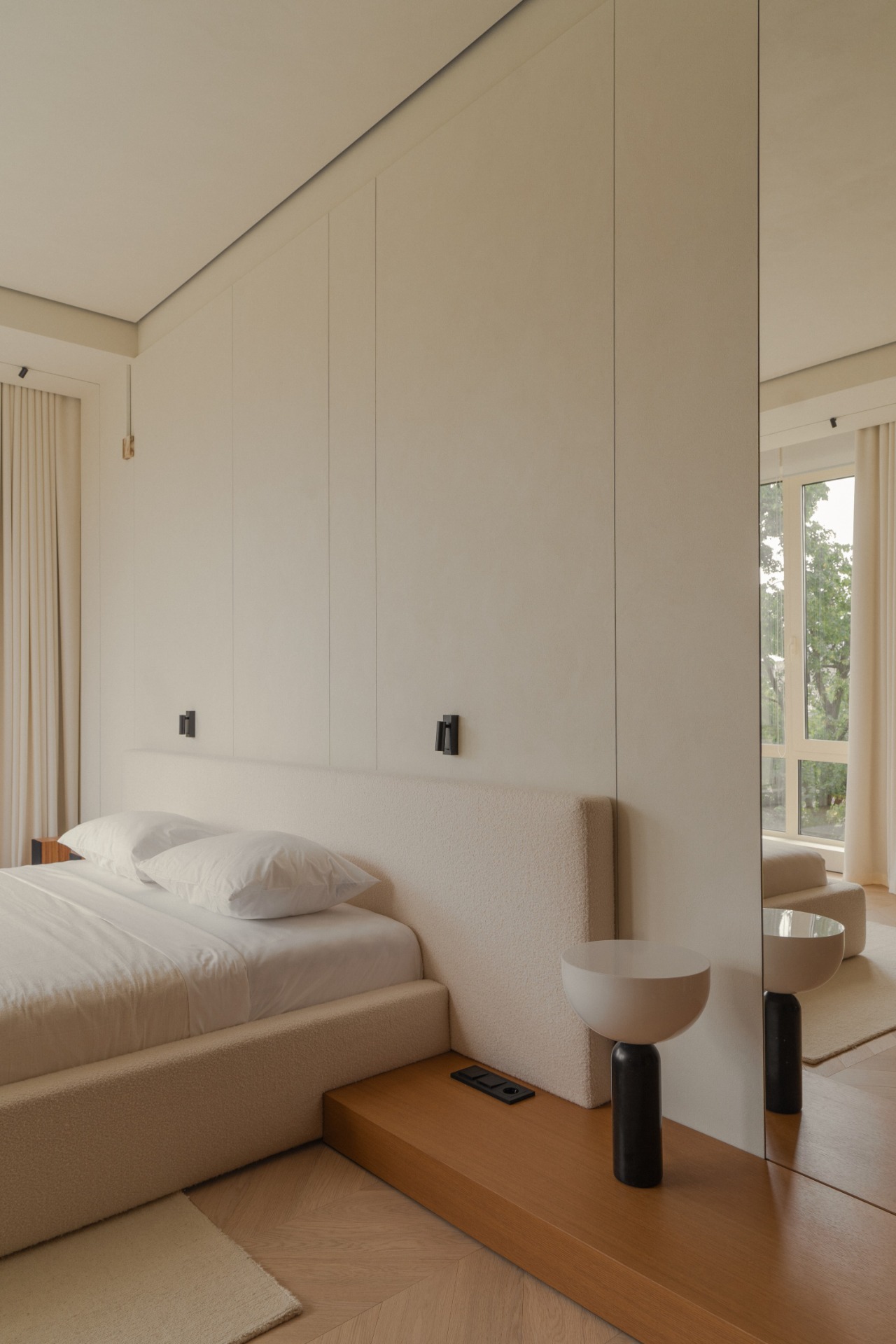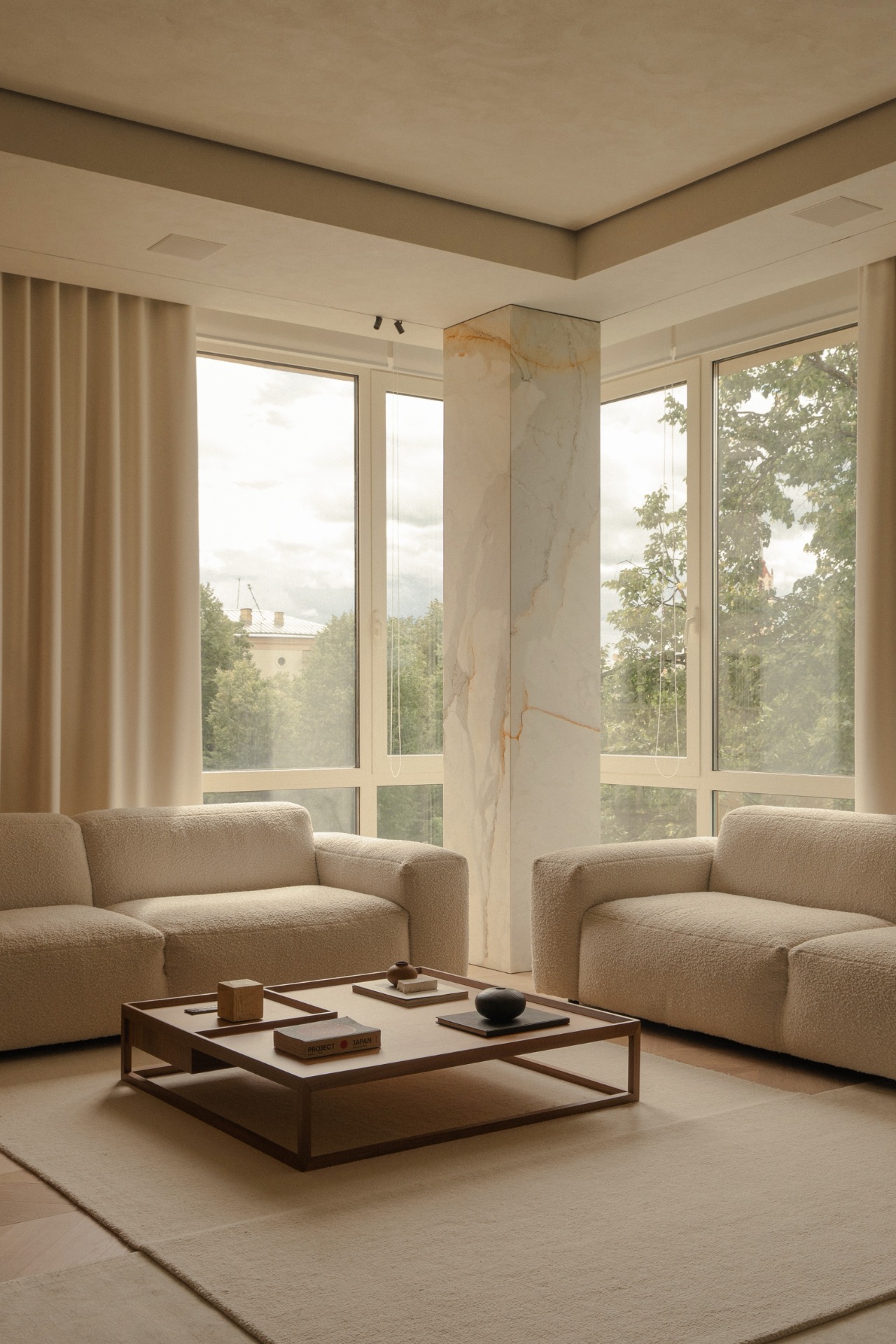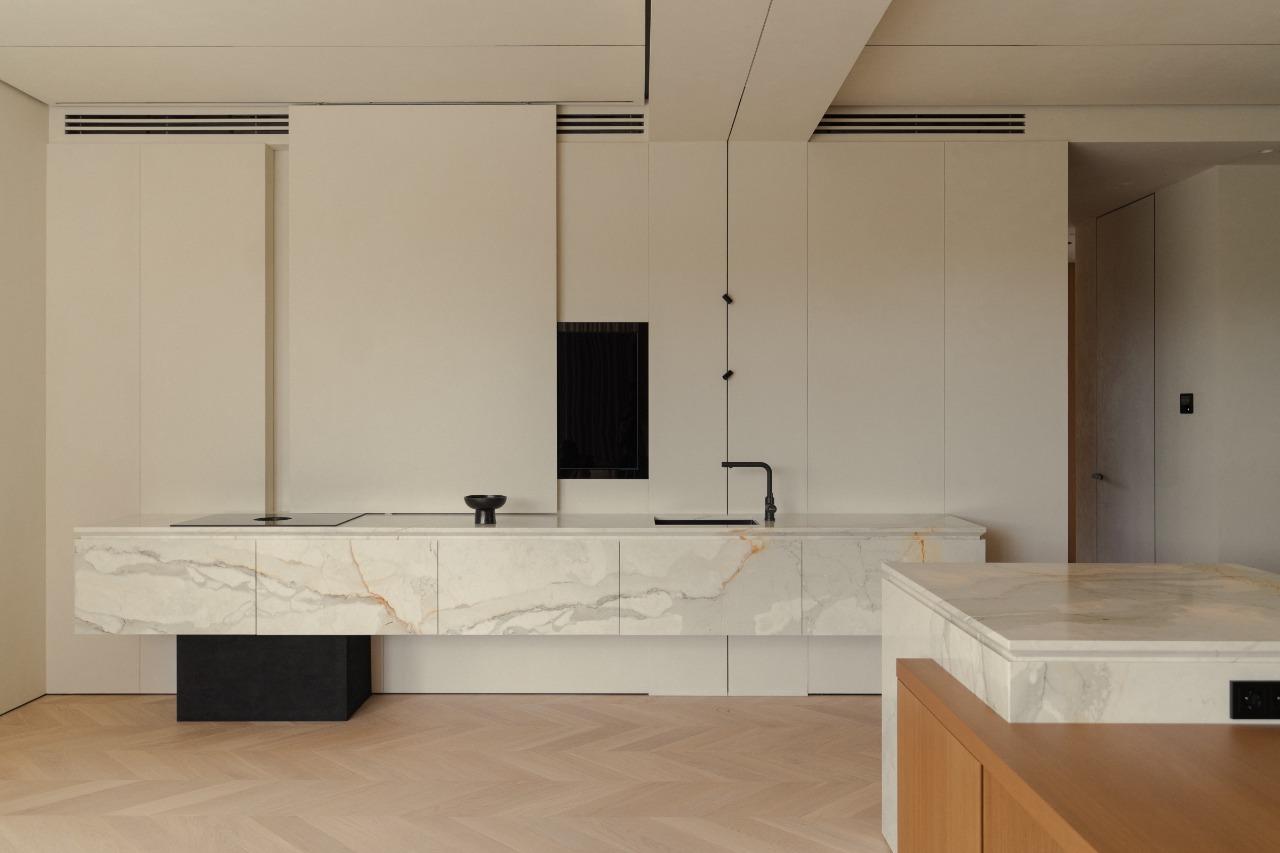It was important for us to maintain harmony in the details and not overload the interior, so the project uses marble with a not very active pattern, light wood and dense fabric of various textures. These materials, combined with unusual interior solutions, nuancedly emphasize the minimalistic character of the space.