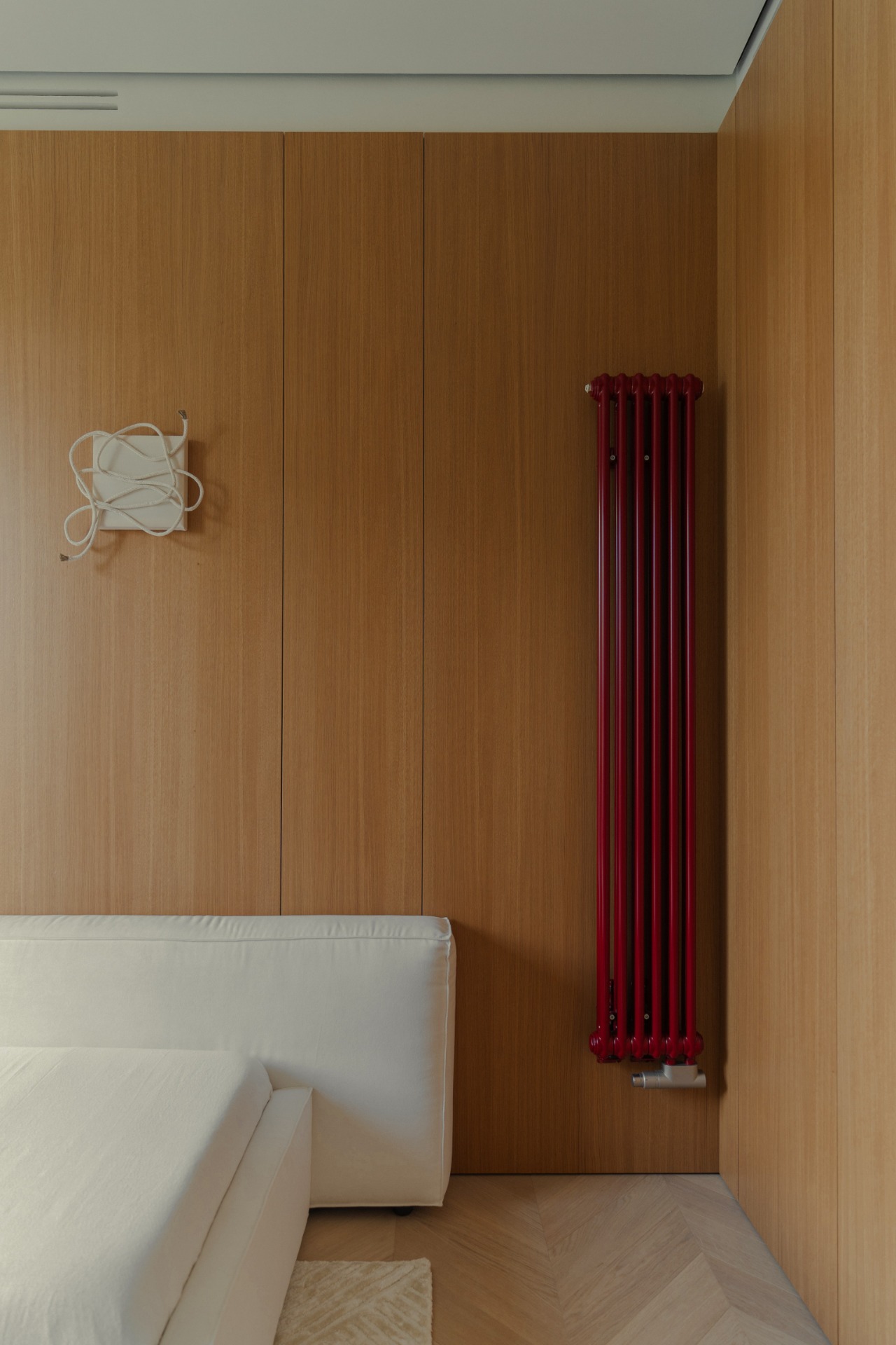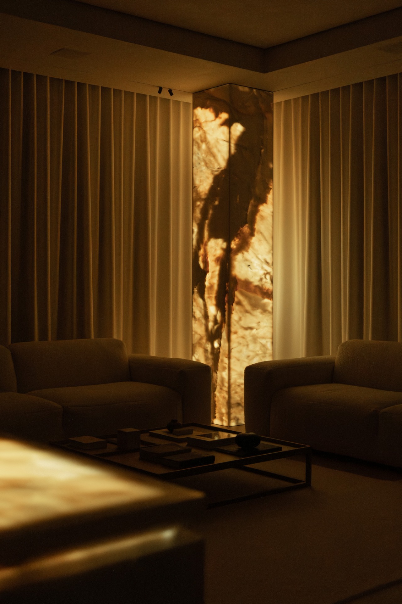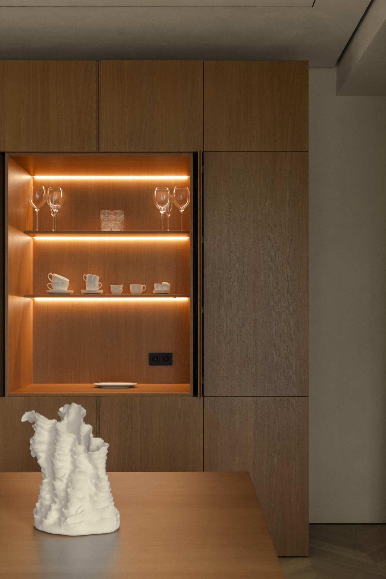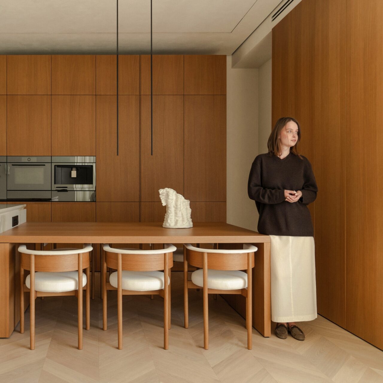 It was important for us to maintain harmony in the details and not overload the interior, so the project uses marble with a not very active pattern, light wood and dense fabric of various textures. These materials, combined with unusual interior solutions, nuancedly emphasize the minimalistic character of the space.