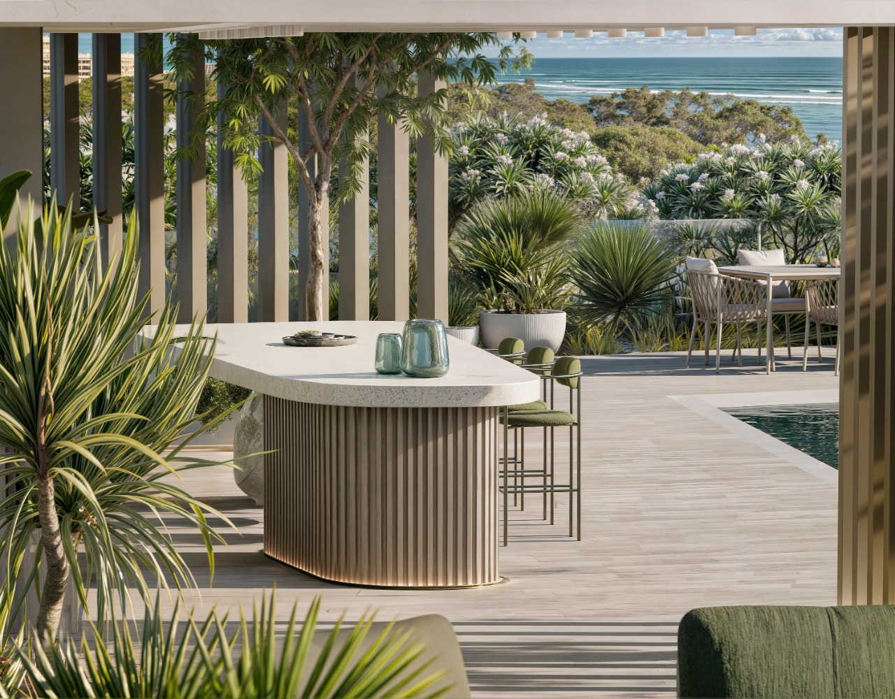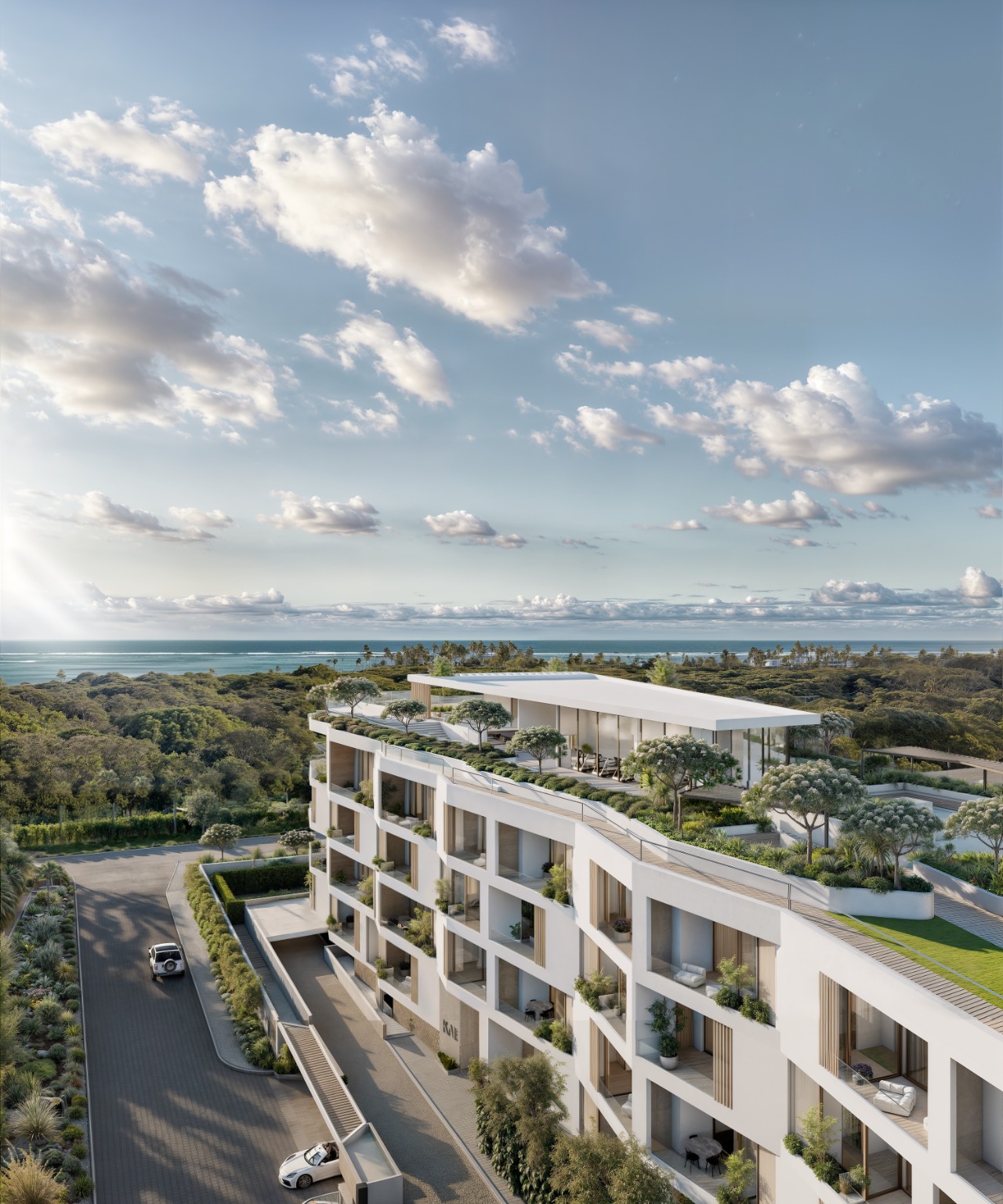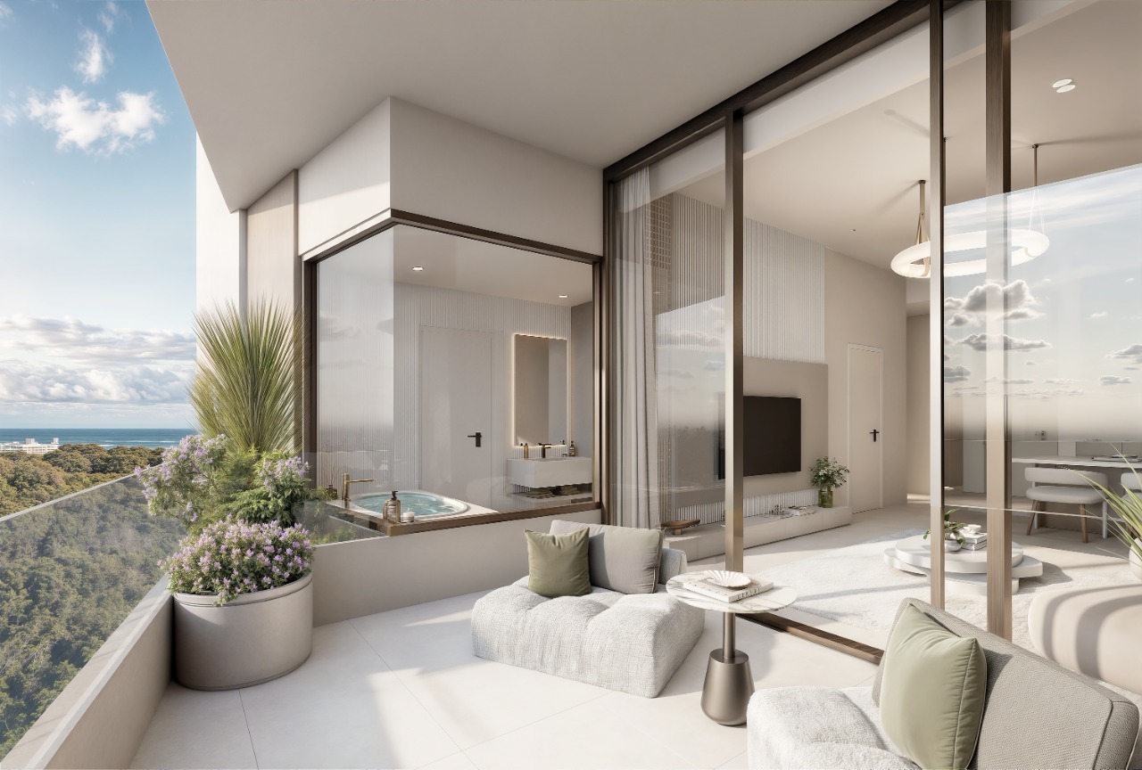 Each residence is conceived with an emphasis on indoor-outdoor connection and flexible living. A key design element is the inclusion of a generous, shaded private loggia that extends the living area and fosters a stronger relationship with the surrounding environment. Inside, open plan layouts seamlessly integrate kitchen and living functions while offering adaptable spaces that can serve as home offices, study areas or guest accommodation. A distinctive signature feature is the placement of a bathtub in each unit, strategically positioned between the bedroom and the loggia to capture uninterrupted ocean views without compromising privacy. This is achieved through deliberate facade orientation and integrated screening.